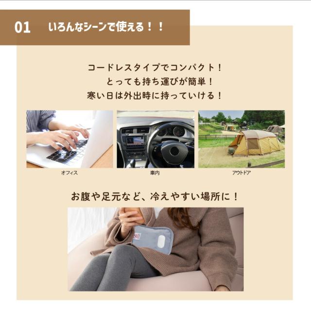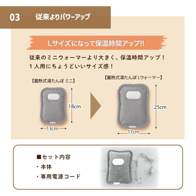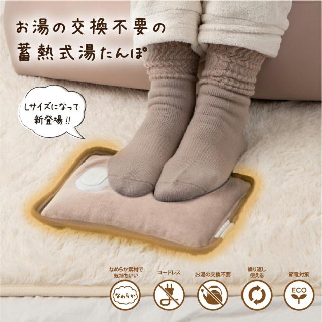 商品情報 | お湯の交換不要の蓄熱式湯たんぽ なめらか素材で気持ちいい!カバーなしで蓄熱後すぐ使える Lサイズになって新登場 【カラー】 ラテベージュ・グレー 【商品サイズ】 約W25×H17cm 【材質】 本体:ポリエステル、ABS、PVC 本体内液:水 電源コード:ABS、PP |