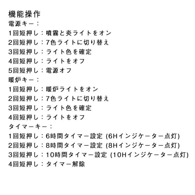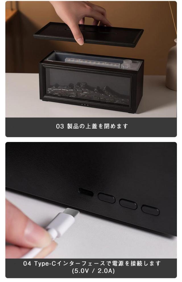 | 注意事項 水タンクの最大水量は280ミリリットルです。注水量が最高水位指示線を超えないようにしてください。超えると霧化効果に影響する可能性があります。 5V / 2Aの入力電源をご使用ください。それ以外の場合、霧化効果に影響したり、本体が故障する原因となります。 霧化器には純水を使用してください。水中の不純物により霧化器が故障する原因となります。 作動中に水タンク内部から音がする場合がありますが、霧化器の作動音であり正常な現象です。 注水および清掃時は、必ず電源プラグを抜いてください。 \ 炎に見惚れる癒し時間、アロマの香りで心までリラックス / 本物の暖炉のように揺らめくLEDの炎と、お気に入りのアロマが織りなすリラクゼーション空間。 コンパクトでもしっかり加湿できる超音波式で、乾燥対策にも◎ 静音設計&空焚き防止機能つきで、就寝中やお仕事中も安心して使用できます。 【おすすめポイント】 ・リアルな炎のようなLED演出 ・アロマオイル対応で香りも楽しめる ・USB Type-C対応/リモコン付きで操作ラクラク ・上部注水式で給水もかんたん ・空焚き防止機能つきで安心 ・どんな空間にもなじむスタイリッシュデザイン 【こんなシーンにおすすめ】 ・おうちでのリラックスタイムに ・就寝前の寝室に ・デスクワーク中の乾燥対策に ・ギフトやプレゼントにも◎ 心も体もふんわりと温めてくれる、冬のマストアイテム。 自分へのご褒美にも、大切な人への贈り物にもぴったりです。 | |