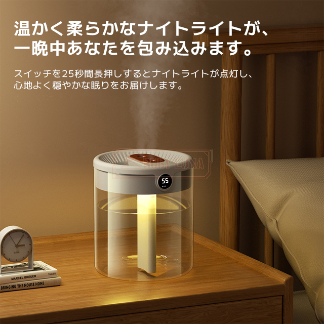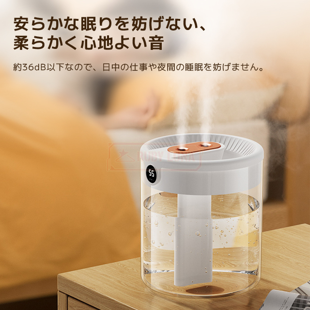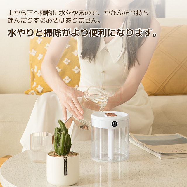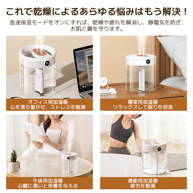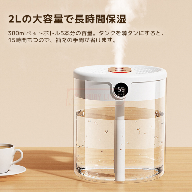 | 【大容量・長時間稼働】 | ◆本製品につきまして、2リットルの大容量タイプなので、寝る前の給水で睡眠中でも加湿をしっかり継続してくれます。効率よく加湿ができます。風邪、鼻やのどが乾燥、静電気が発生、アレルギー、喘息など病気を抑制でき、秋、冬季節に最適です。また、女性にとっては大切な美肌効果もあります。 |