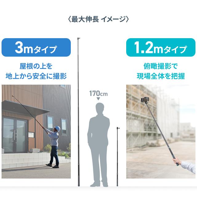 ⇒ご購入の前にご確認下さい軽量カーボン製の1.2m高所撮影ポール。現場撮影や点検に便利。手に馴染むシリコンハンドルで安定撮影。スマホ・カメラ対応で、地上から安全に高所撮影が可能。軽量構造で持ち運びも快適。【WEB限定商品】