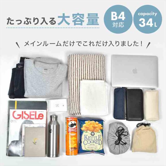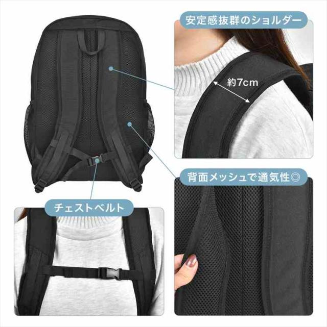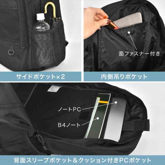 34Lの大容量サイズで、A4ファイルやPC、教科書、部活の荷物までしっかり収納可能。ポケットは合計8箇所あり、小物を整理しやすく、通学リュックとしても通勤バッグとしても活躍します。撥水加工素材で雨の日も安心◎クッション入りのPCポケットやサイドポケット、Dカン2箇所付きなど、細やかな機能が充実しています。高校生・大学生の通学用はもちろん、社会人の通勤バッグ、旅行やレジャーなど幅広いシーンで使える万能リュックです。