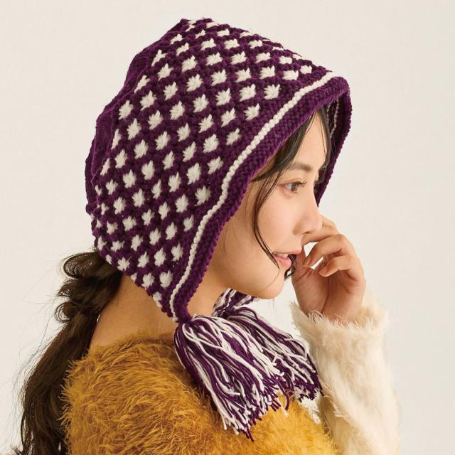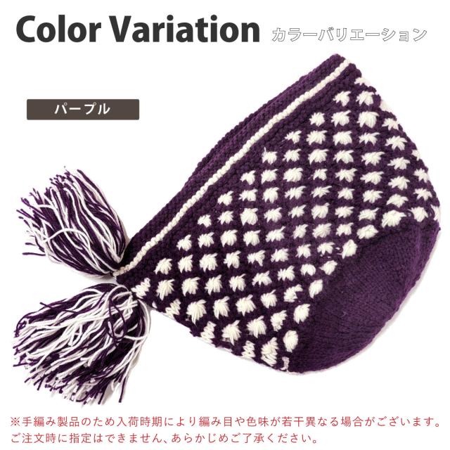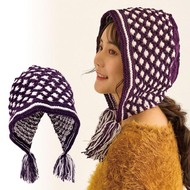 締めつけ感ゼロ フード ニット帽 手編み 耳あて付き 揺れるタッセル 帽子 バブーシュカ 冬 耳まであったか 民族風 フード帽 パープル knit-1732 耳あて 冬 メンズ 防寒 レディース ポンポン 男女兼用 お洒落 プレゼント 即納【メール便送料無料】