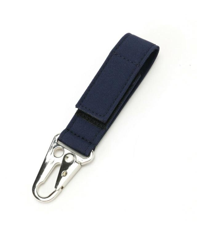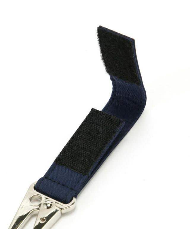 ポーチの携帯やフックなどを取り付けられる、ベルクロで着脱可能なカラビナ付き。