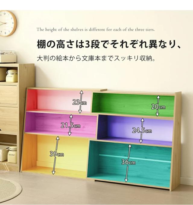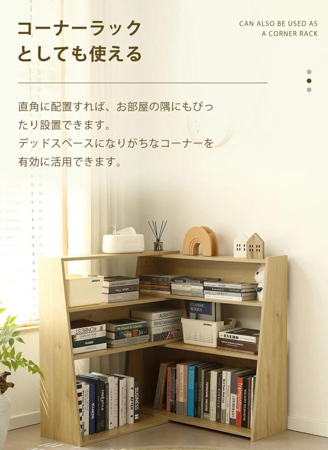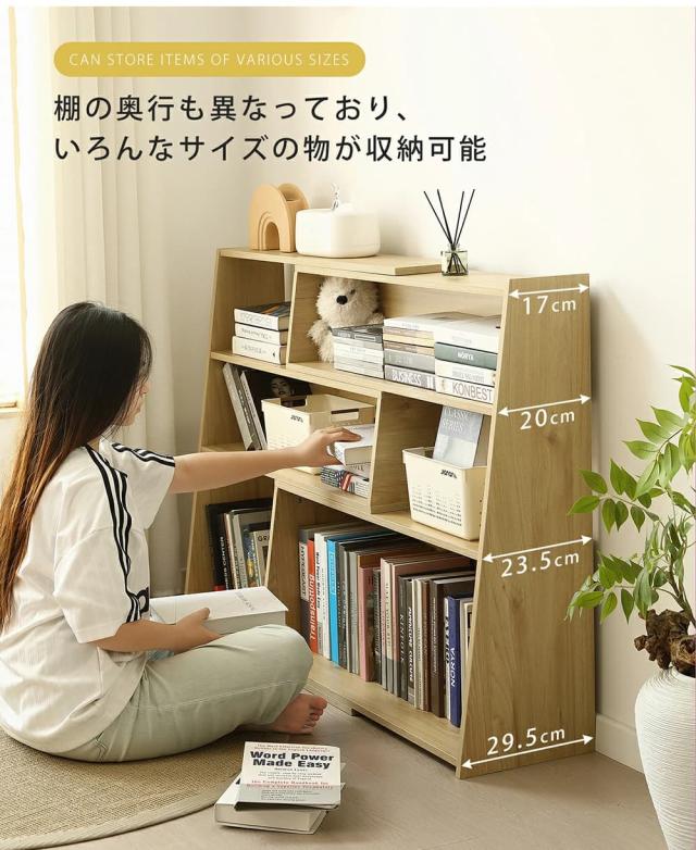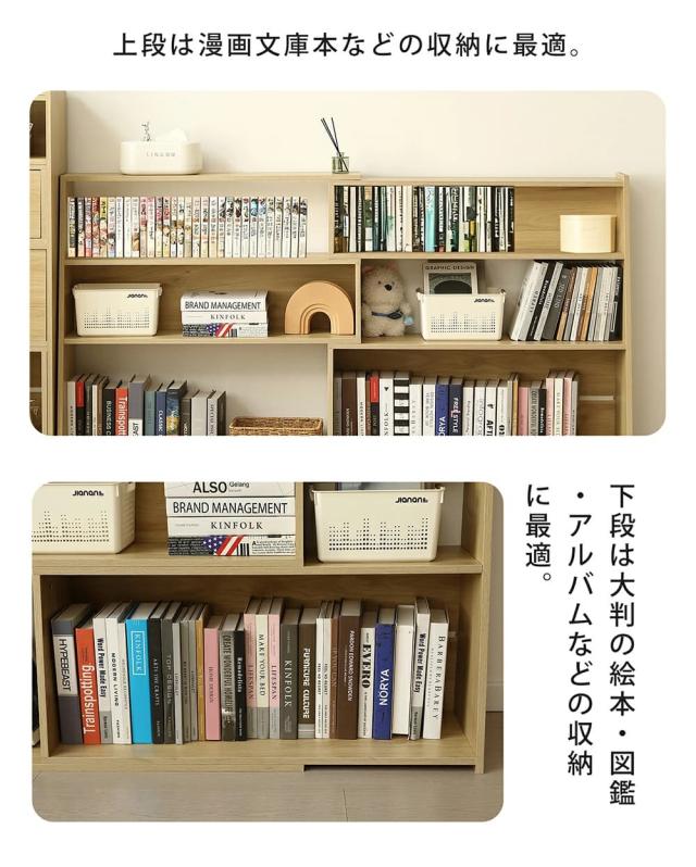 絵本から文庫本まで、サイズの異なる本をすっきり整理でき、リビング・寝室・キッチンなど、どんな場所にもマッチします。
