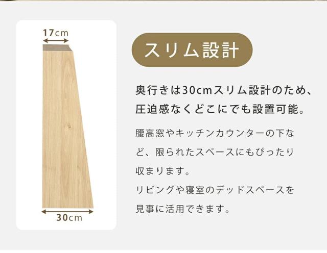 奥行わずか30cmのスリム設計。壁際や窓下、カウンター下など限られたスペースにもフィット。狭い空間でも圧迫感なく、すっきりと設置できます。