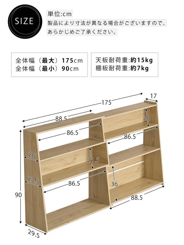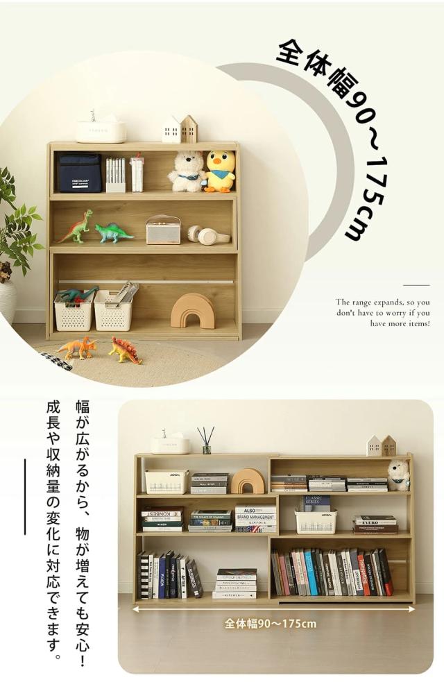 【全体幅90〜158cm】幅が広がるから、物が増えても安心!成長や収納量の変化に対応できます。棚の高さは3段でそれぞれ異なり、大判の絵本から文庫本までスッキリ収納。下段は大判の絵本・図鑑・アルバムなどの収納に最適。