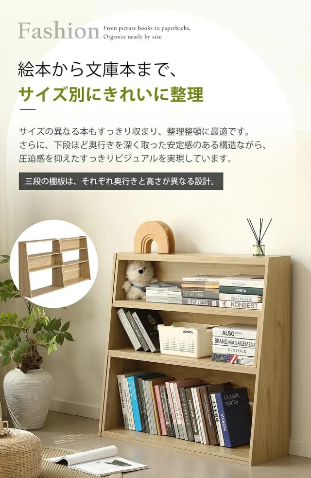 棚板は3段構造で、それぞれ奥行きと高さが異なる設計。大判の絵本・アルバム・雑誌から小型の文庫本まで、種類ごとにきれいに整理できます。