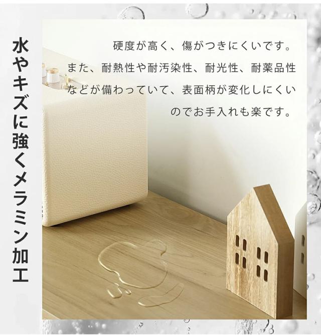 表面はメラミン加工でキズや汚れに強く、お手入れも簡単。耐熱性・耐水性・耐光性を兼ね備え、長く清潔にお使いいただけます。