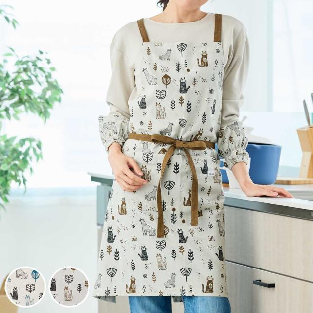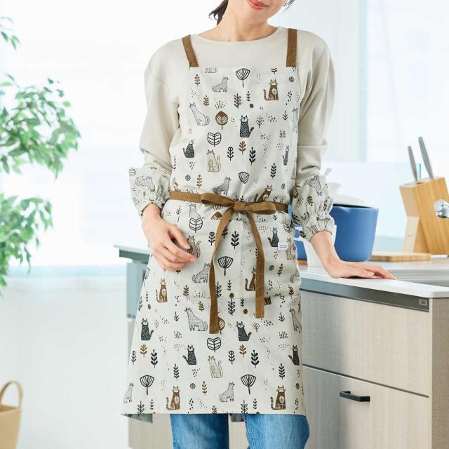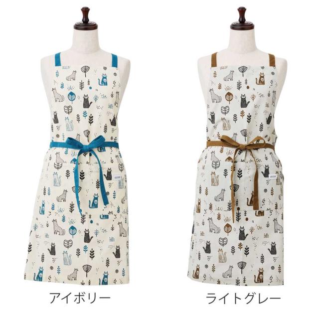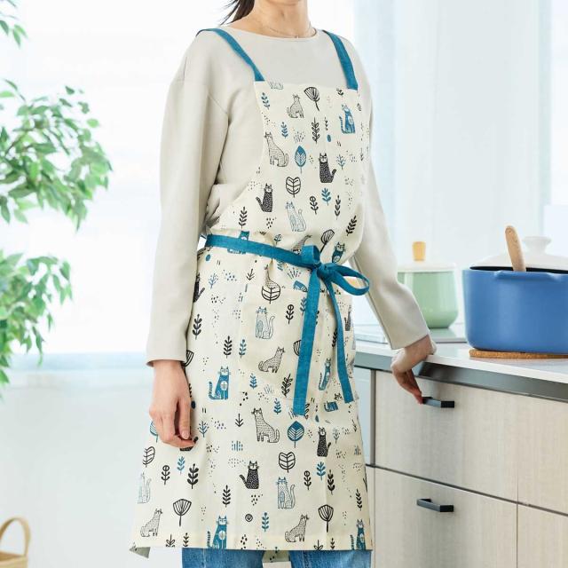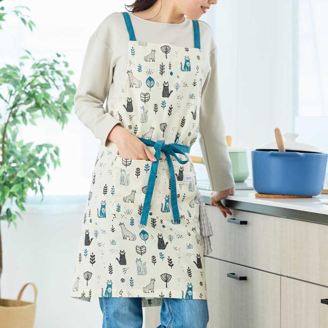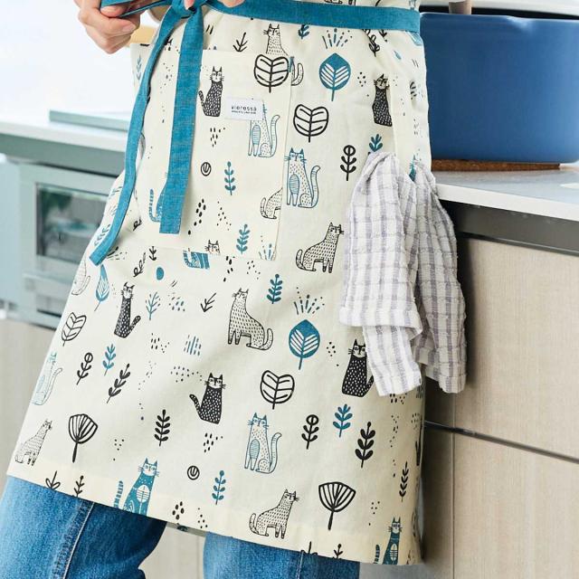 北欧風のネコ柄が目を引く、愛らしいデザインの「ヴィエレッサ」シリーズのエプロンです。綿100%のやさしい肌ざわりで、通気性も良く、オールシーズン快適に着用いただけます。