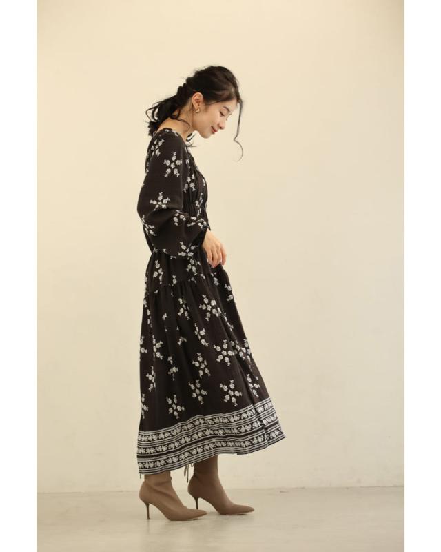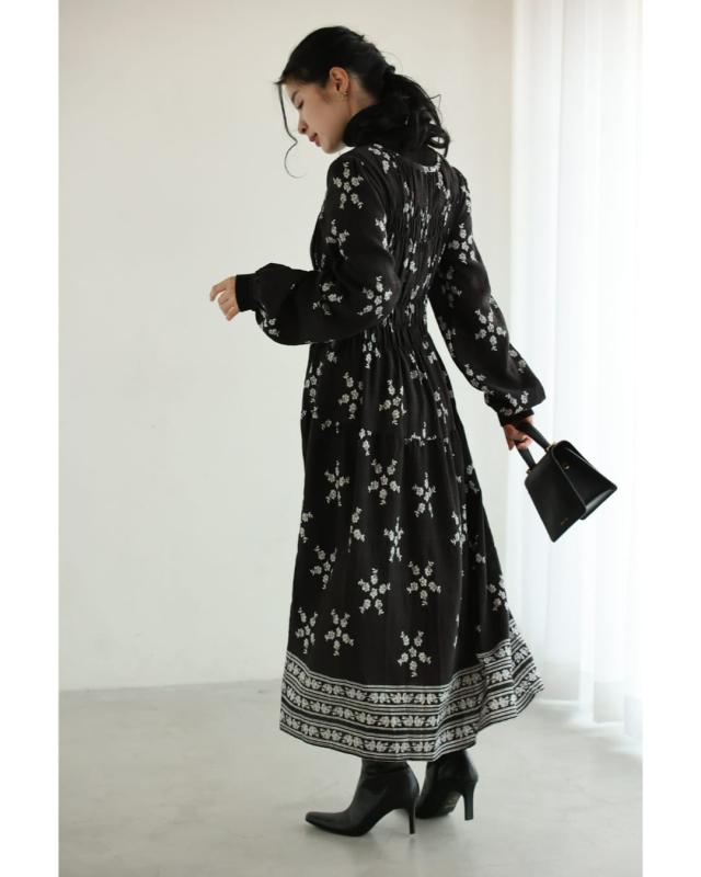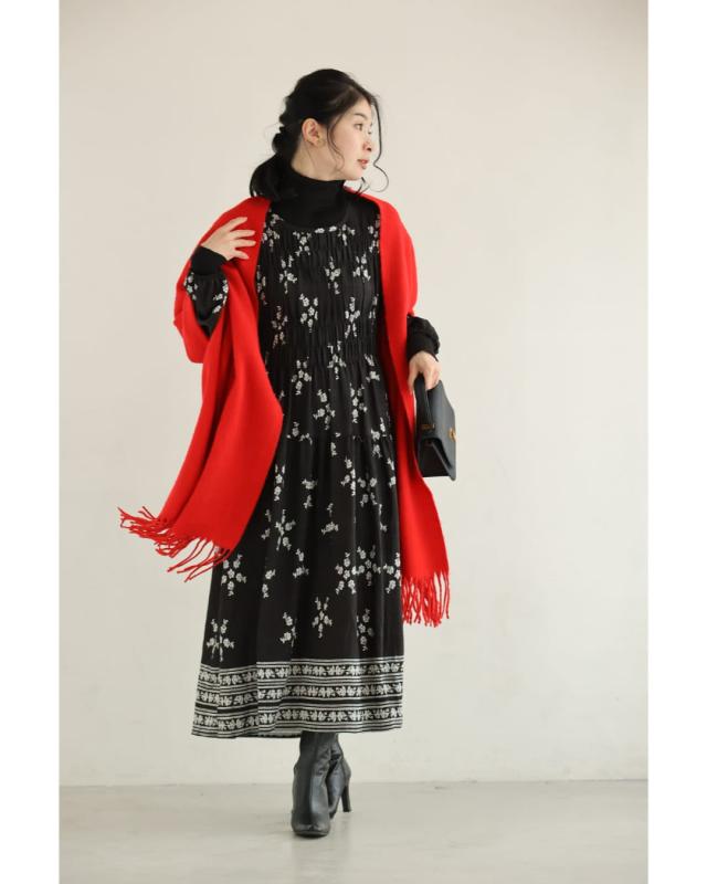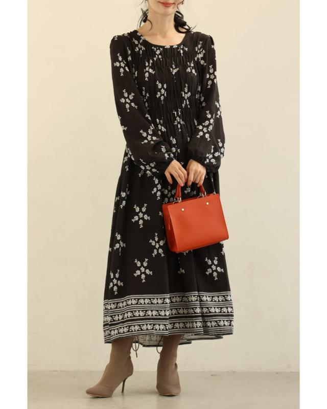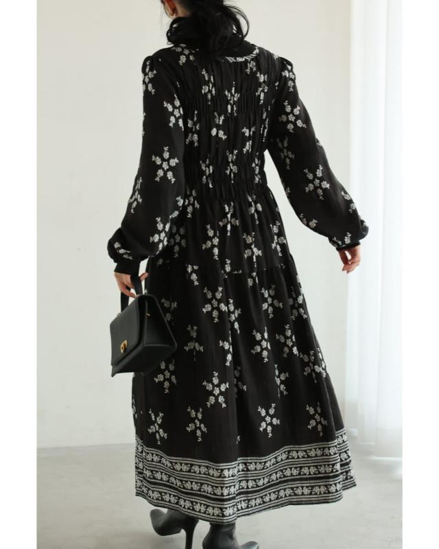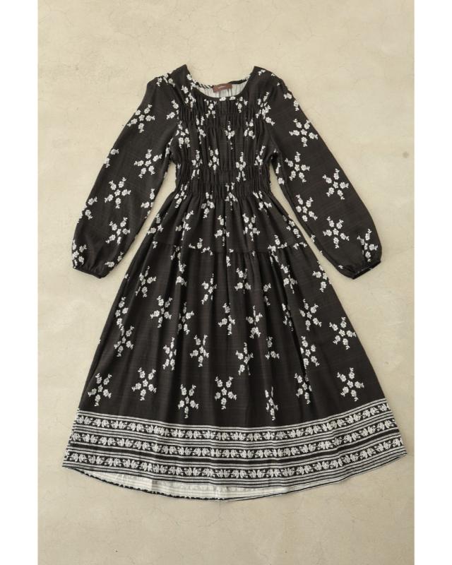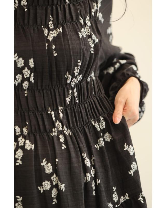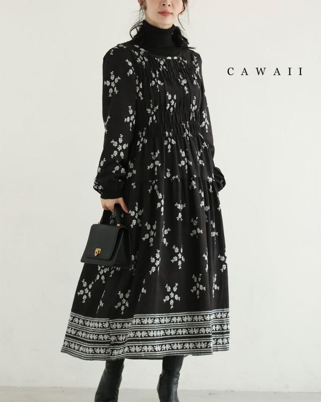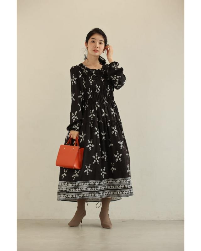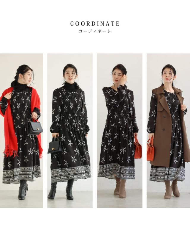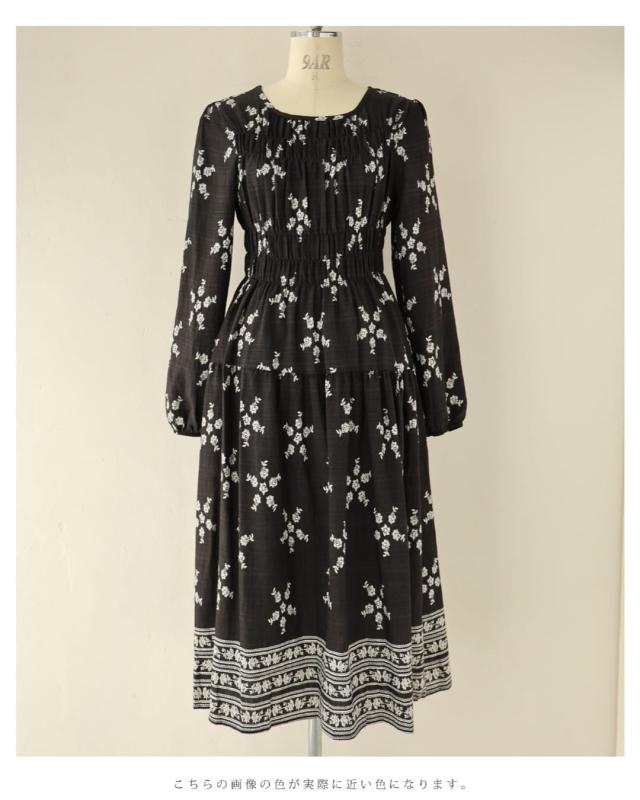 wkj00303 新作 新着 再入荷 CAWAII FRENCHPAVE フレンチパヴェ エレガント ベーシック カジュアル 可愛い かわいい カワイイ おしゃれ オシャレ お洒落 個性 個性的 定番 ベーシック 大人かわいい 大人可愛い 上品 女性らしい デザイン スタンダード ナチュラル きれいめ キレイめ シンプル フェミニン レディース レディースファッション 大人 ママ ミセス 30代 40代 50代 60代 花と花を結ぶ胸元シャーリングミディアムワンピース 長袖 S M L XL ワンサイズ フリー 小さめ 小さい 低身長 痩せ ほっそり 小柄 細身 標準サイズ 大きめシルエット 大きい ビッグシルエット ゆったり F サイズ自由 春 秋 冬 秋服 秋物 冬服 冬物 楽ちん ブラック 黒 柄 総柄 花 フラワー 普段着 日常使い おでかけ 旅行 女子会 デート 大人女子 シャーリング 可憐