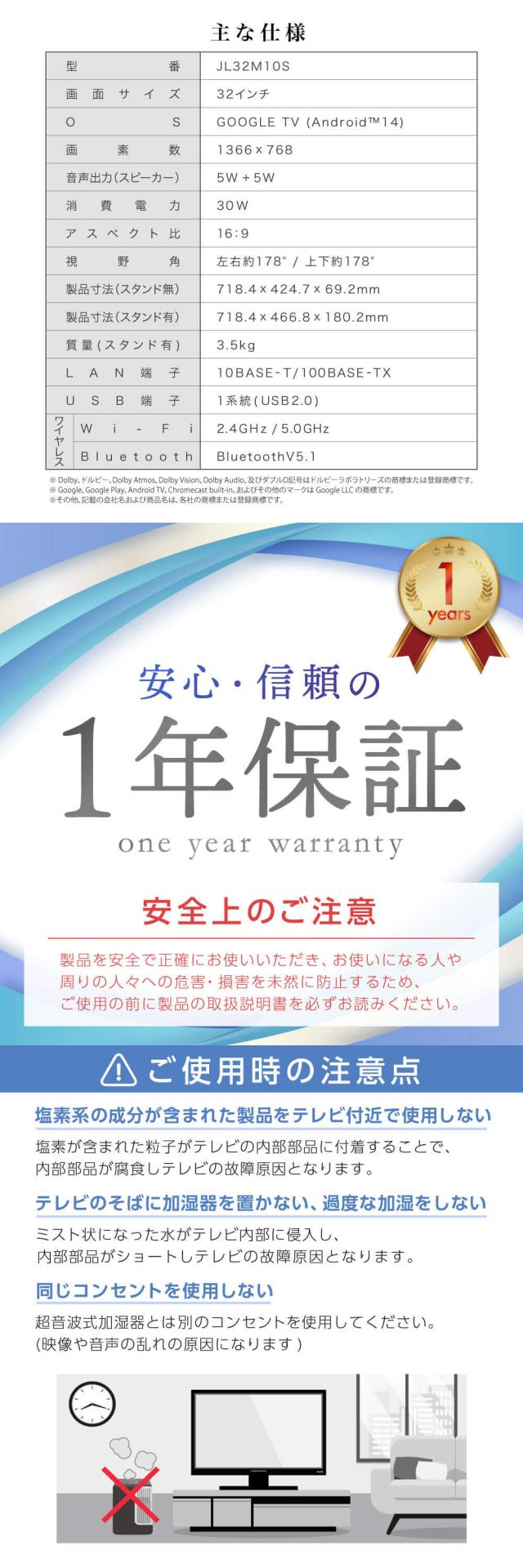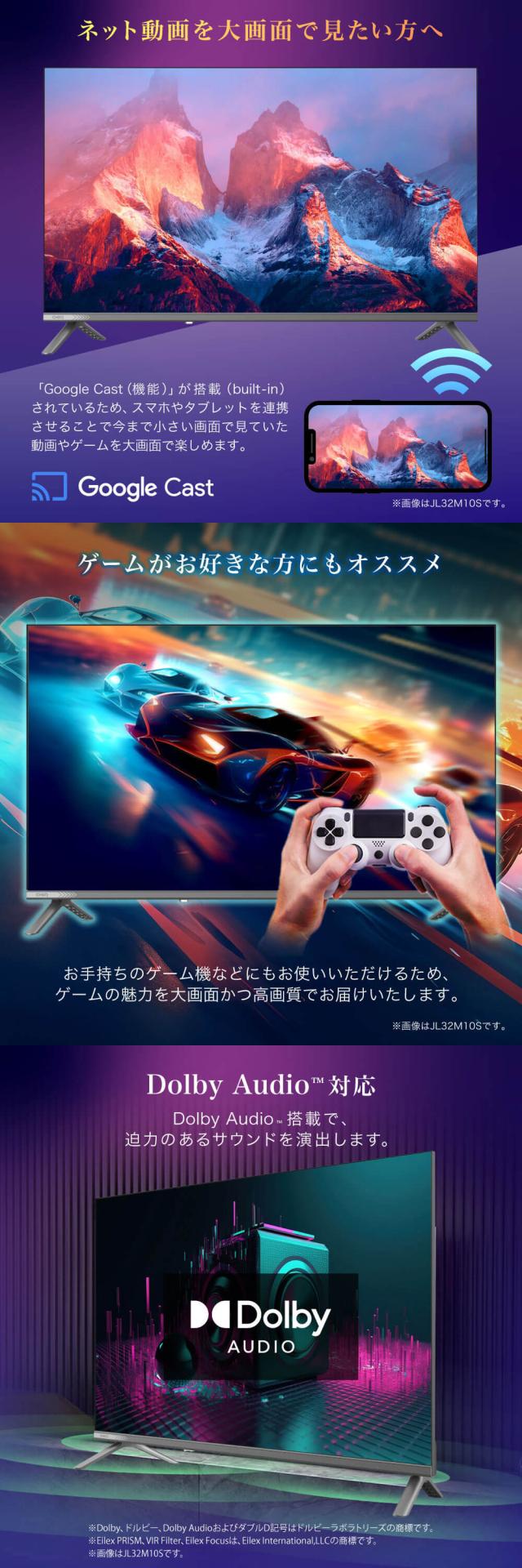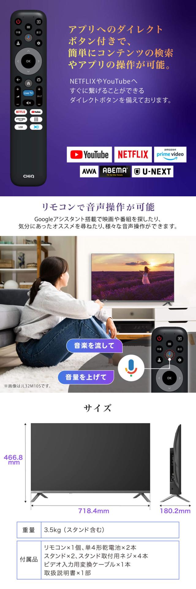 チューナーレス テレビ 32型 Googleテレビ 32インチ スマートテレビ HDR対応 GoogleCast スマホ連動 Bluetooth Googleアシスタント Dolby Audio HDMI2系統 YouTube Prime Video JL32M10S CHiQ