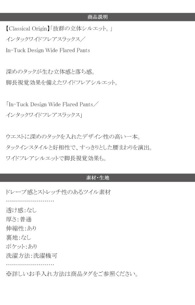 「In-Tuck Design Wide Flared Pants/インタックワイドフレアスラックス」。