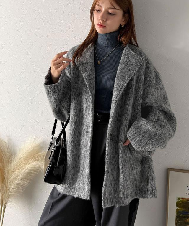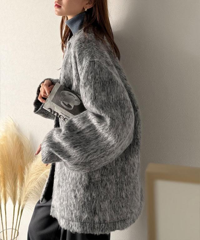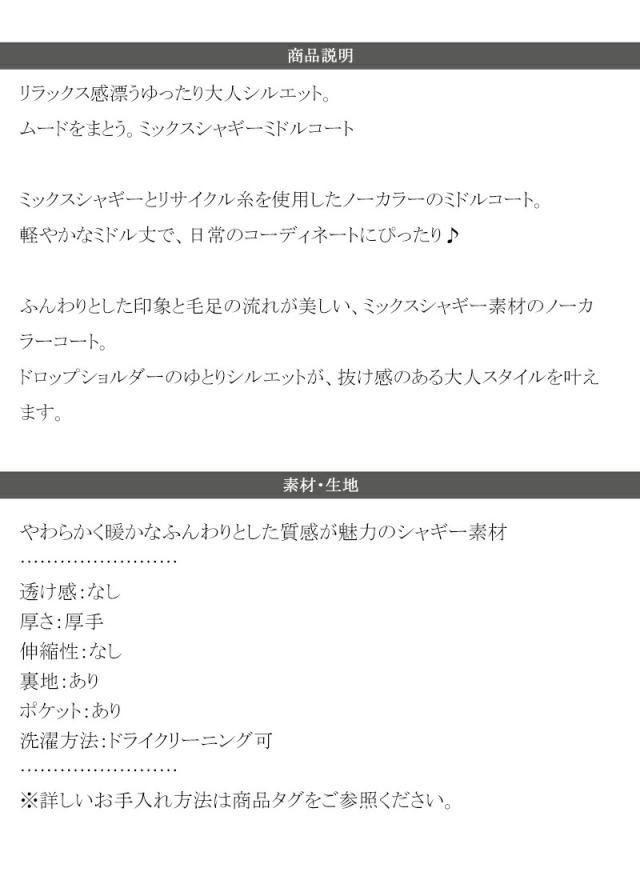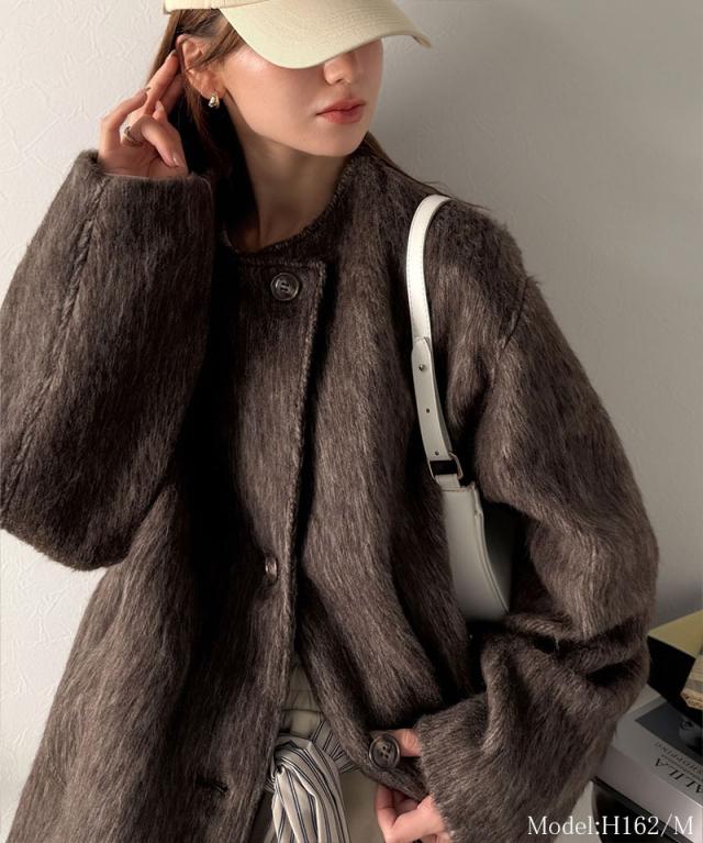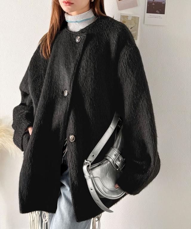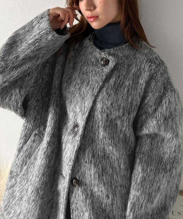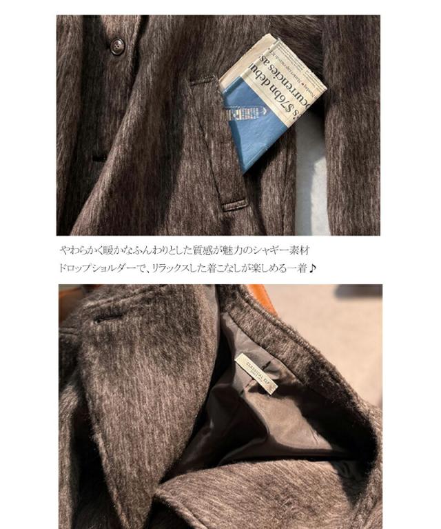 クラシカルエルフ冬新作 アウター ジャケット レディース ミックス シャギー 素材 ミドルコート ノーカラーデザイン ドロップショルダー レイヤードコーデ 大きいサイズ 2025aw ce1010459