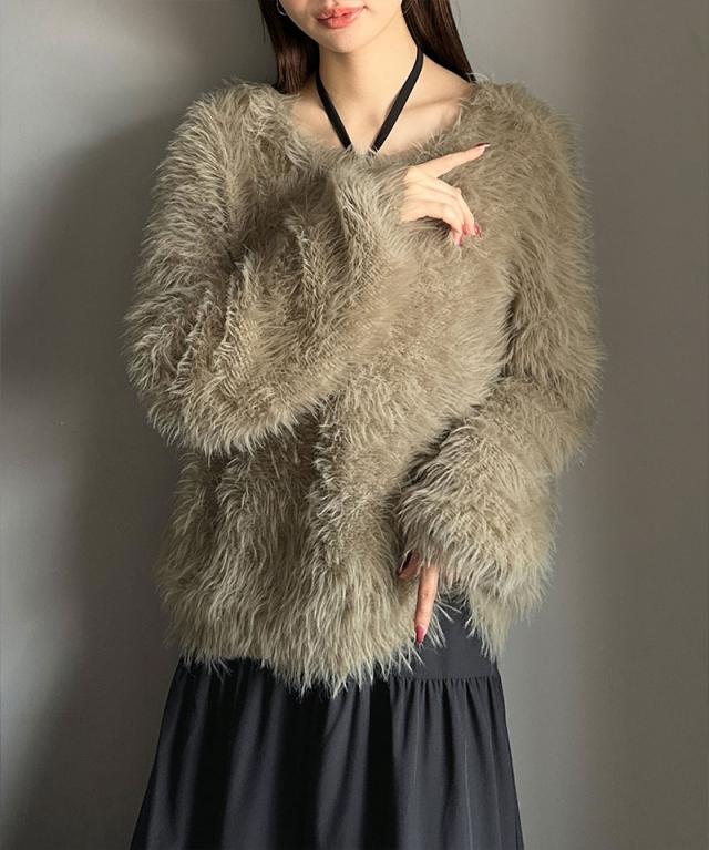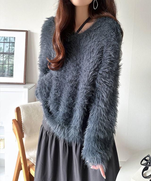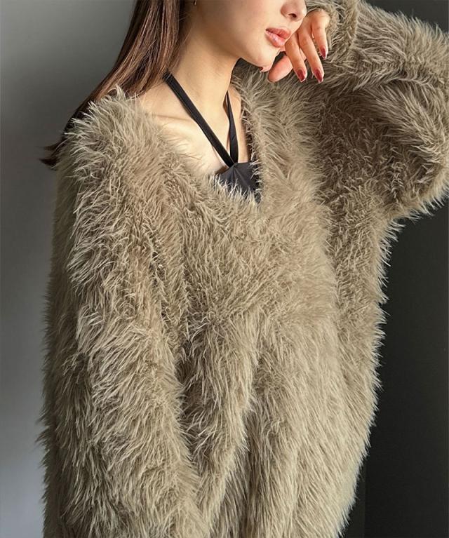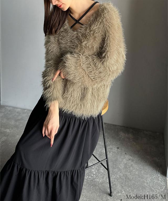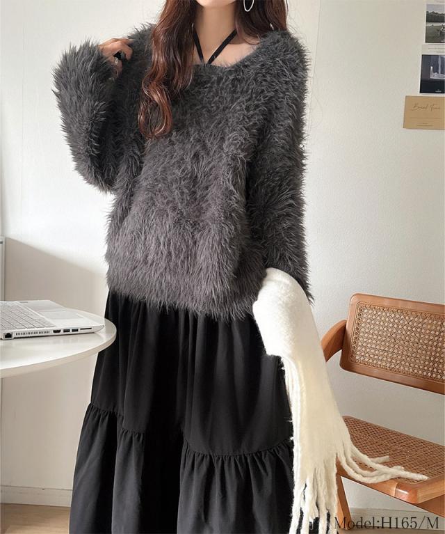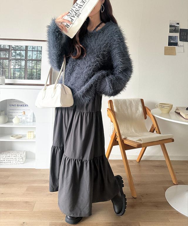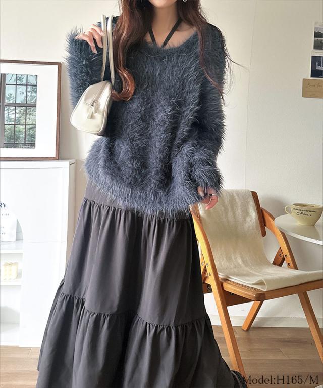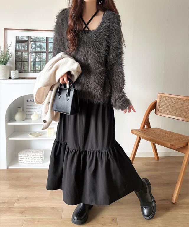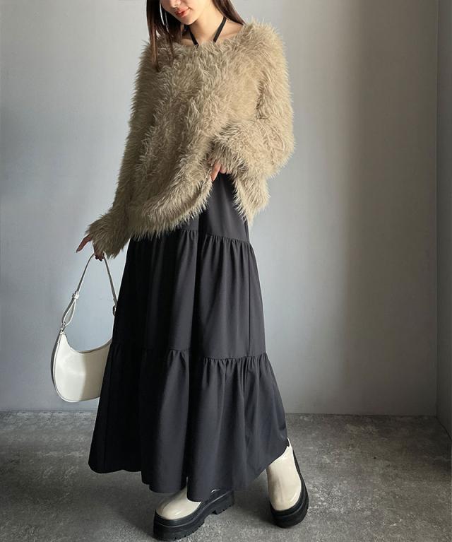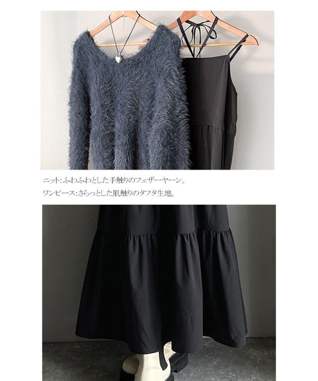 ティアードデザインが可愛いキャミワンピースと、柔らかく暖かなシャギーニットのセット。