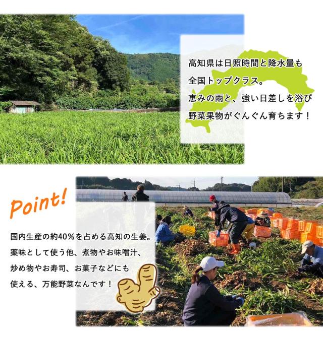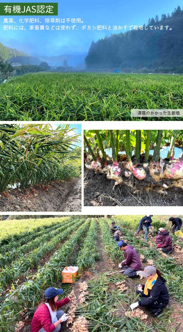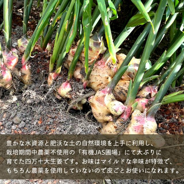 豊かな水資源と肥沃な土の自然環境を上手に利用し、栽培期間中農薬不使用の「有機JAS圃場」にて大ぶりに育てた四万十大生姜です。