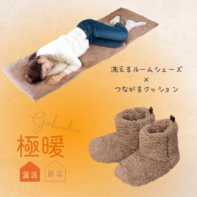 極暖 つながる あったかクッション・洗えるルームシューズ セット あったかグッズ あったか スリッパ ルームシューズ 足 足先 足元 グッズ 室内 もこもこ あたため 防寒 冷え性 冷え 対策 家事 育児 暖かい 冬用 冬 寒い お尻 長方形 正方形 クッション 車 ソファ