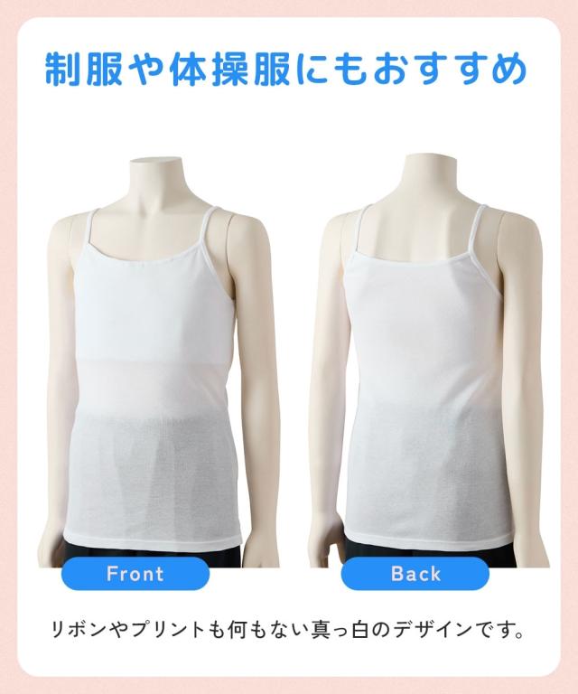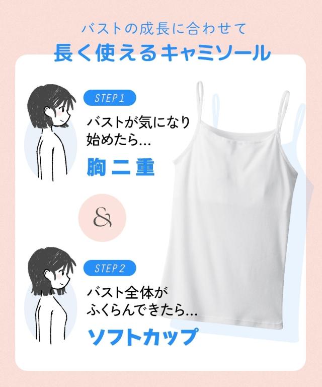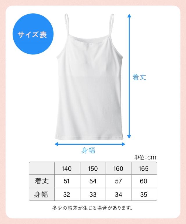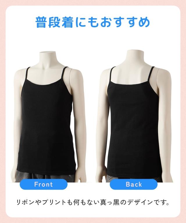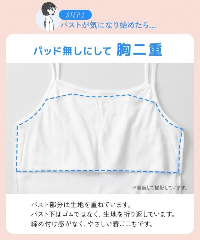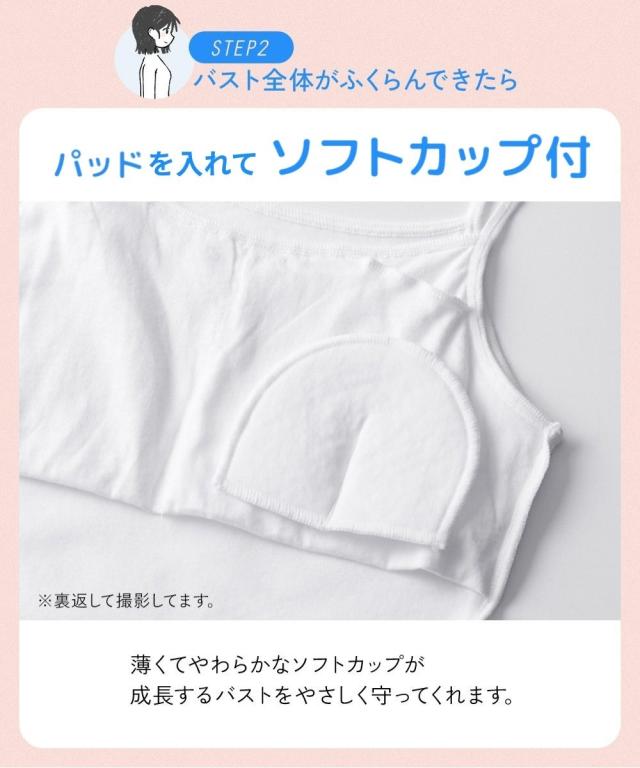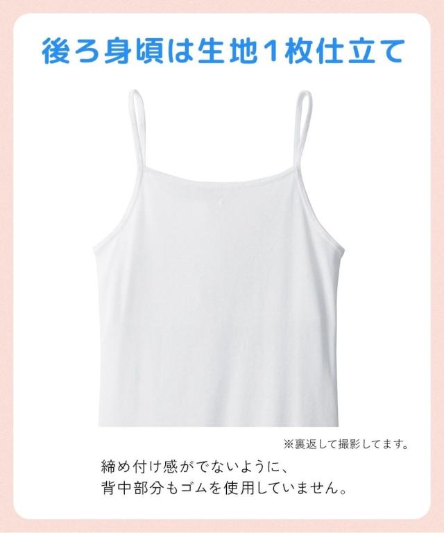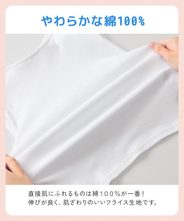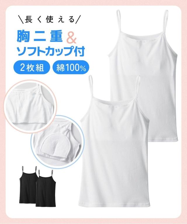 成長に合わせて長く使える!綿100%胸二重&ソフトカップ付キャミソール2枚組☆彡 ソフトカップは取り外し可能! バストトップが気になり始めたらソフトカップ無しで胸二重インナーとして、バストがふくらみはじめたらソフトカップを入れてお使いいただけます。 ーこんな方におすすめー ・バストのふくらみが気になり始めた小中学生 ・初めてのブラジャー選びにお悩みの方 ・締め付け感が苦手なお子様 ・肌ざわりのよい肌着をお求めの方 <特徴> ■身生地はやわらかな綿100% 毎日直接肌にふれるものだから綿100%にこだわりました。 伸びがよく肌ざわりのいいフライス生地です。 ■ストラップ部分も綿100% 着用感を第一に考え、ストラップ部分も綿100%にこだわりました。 調節アジャスターも無いので、ゴロつき感がありません。 ■窮屈感ゼロ! バスト下にも背中部分にもゴムを使用していないから、窮屈感がありません。 ■真っ白or真っ黒 シンプルが一番!リボンやプリントを全くつけていません。 【白2枚組】制服や体操服の下にもおすすめです。 【黒2枚組】Tシャツやトレーナーから見えても下着っぽく見えません。 ■セット組 毎日着用するものだから、洗い替えに