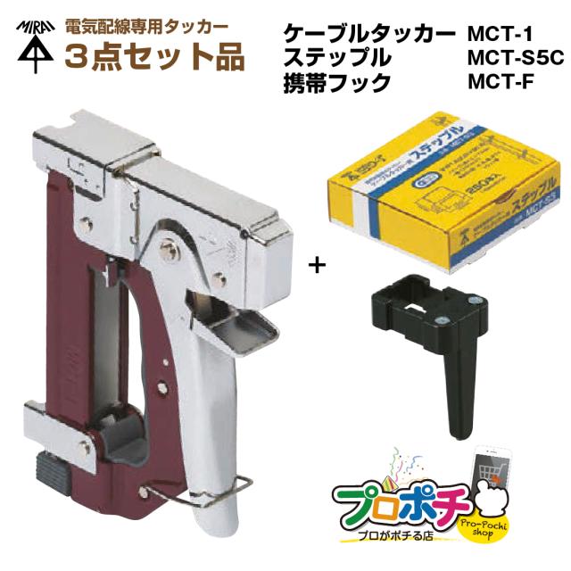 即配 電気配線専用タッカー3点セット! (ケーブルタッカー×1個 MCT-1 / ステップル×250個入 MCT-S5C / 携帯フック×1個 MCT-F) ケーブル 固定 工具 ステップル 携帯フック 未来工業 ミライ 電設資材