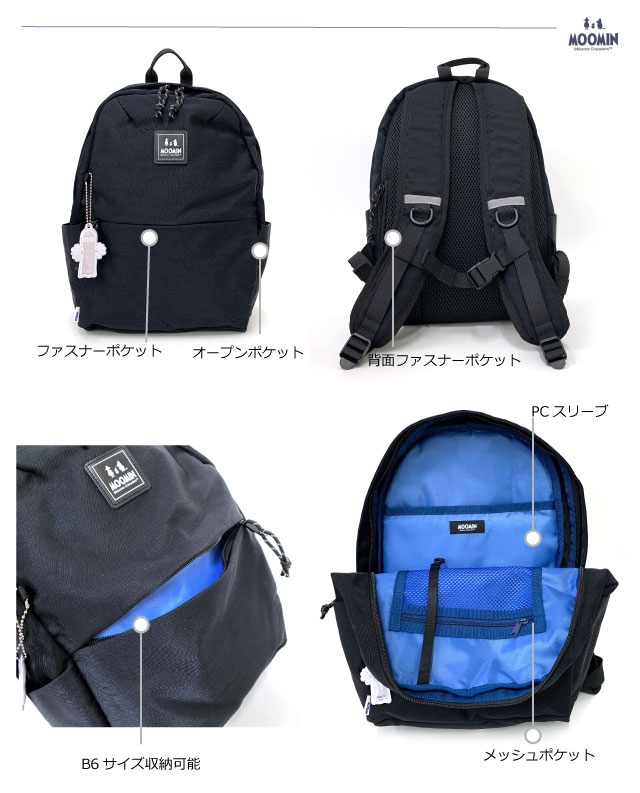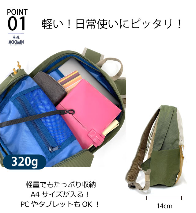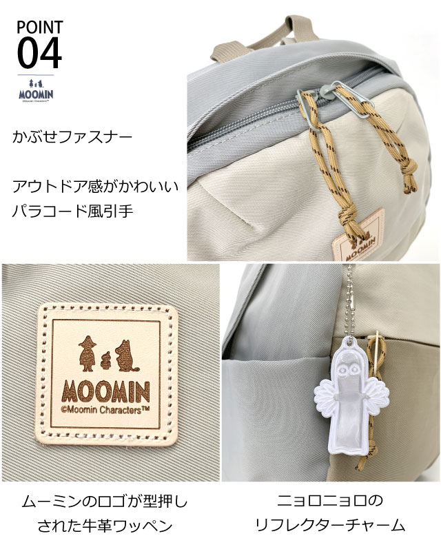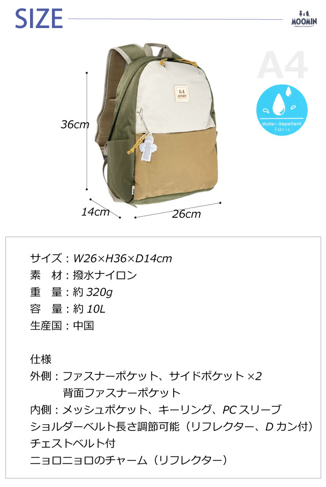 ![]() ![]() ![]() ![]() ![]() ![]() ![]() ![]() ![]() ・MOOMIN ムーミン MOOMINの可愛らしいキャラクターが随所にあしらわれたデザインだけでなく、バッグとしての機能性も備わった実用性もあるシリーズです。 軽量、撥水で使いやすいリュックサック。 背面ポケット付きで貴重品も安心です。また、身体にフィットするチェストベルト付きで 背面とショルダーはクッション入りのメッシュ仕様。蒸れを軽減し、背中にやさしいデザイン設計です。 人気のあるニョロニョロのリフレクターチャーム付きで、夜間のお出かけも安心です。
