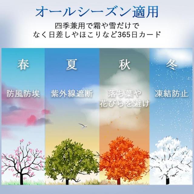 ◆大面積の設計で、エンジンカバー・助手席側窓ガラス・フロントウィンドウ・ 運転席側窓ガラス・リアビューミラーを全面保護できます。