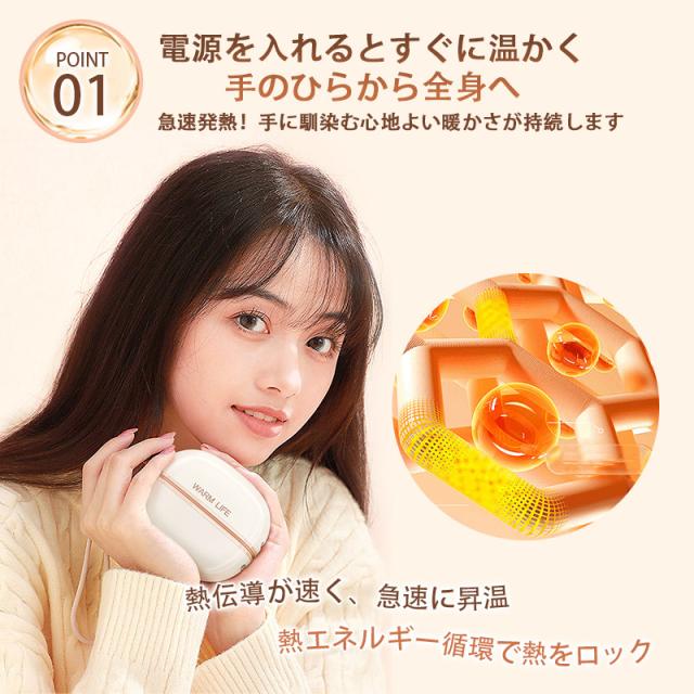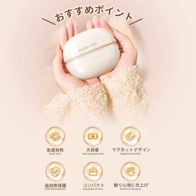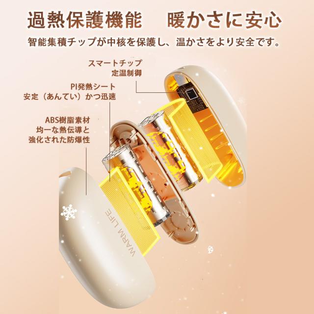 安全安心あったかの充電式カイロです。過発熱、ショート防止機能によりお客様の安全性に配慮しています。滑らかな肌のような触り心地に仕上げました。均等に発熱し、優しい暖かさで冷えた両手を暖め
