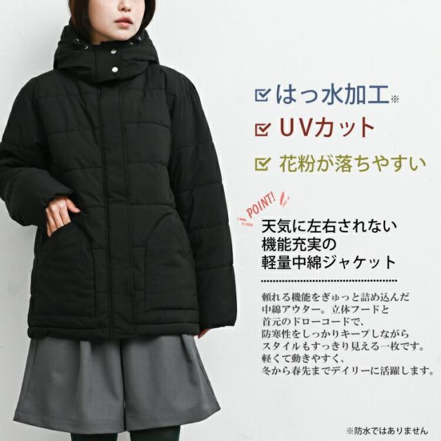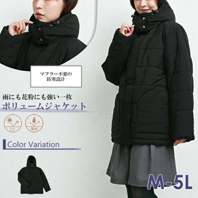 cp-aw-jk0654 雨にも花粉にも強い中綿入りボリュームジャケット。 大きいサイズ レディース 長袖アウター 長袖ジャケット ボリュームジャケット フェイクダウンジャケット 中綿コート 中綿ジャケット 撥水コート ジャンパー ミドル丈 ミディアム丈 無地 長袖 スタンドカラー フーディー フード付き スタンドカラー ボリュームカラー ファイバー綿 ジップアップ ファスナー ZIP ポケット アウター 上着 秋服 冬服 秋物 冬物 秋アウター 冬アウター 秋コート 冬コート 秋冬アウター 秋冬ファッション 防寒 防風 風を通しにくい 軽い 軽量 ライトジャケット 暖かい あたたかい あったかい はっ水加工 撥水加工 水を弾きやすい UVカット UV対策 UVSS 日焼け防止 日焼け対策 紫外線対策 花粉が落ちやすい 花粉対策 ゆったり 大きめ 体型カバー 大きめシルエット 透けない 裏地あり 大人 フェミニン ナチュラル カジュアル きれいめ かわいい 着こなし おしゃれ 定番 秋コーデ 冬コーデ ファッション 大きめ 女性 婦人用 ミセス 30代 40代 50代 2025 冬新作 秋 冬 黒 ブラック M LL 3L 4L 5L 9号 13号 15号 17号 19号 cp-aw-jk0654