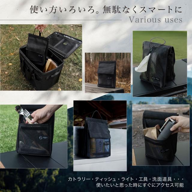 マジックテープの方はマチがついた広めのポケットになっているため、キャンプギアはもちろん、洗顔料や化粧水などのトラベル用品など、あらゆるものを入れておくことができます。
