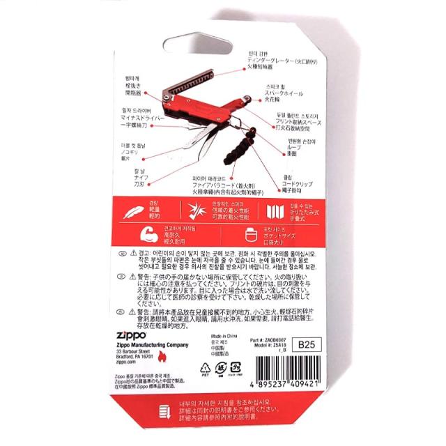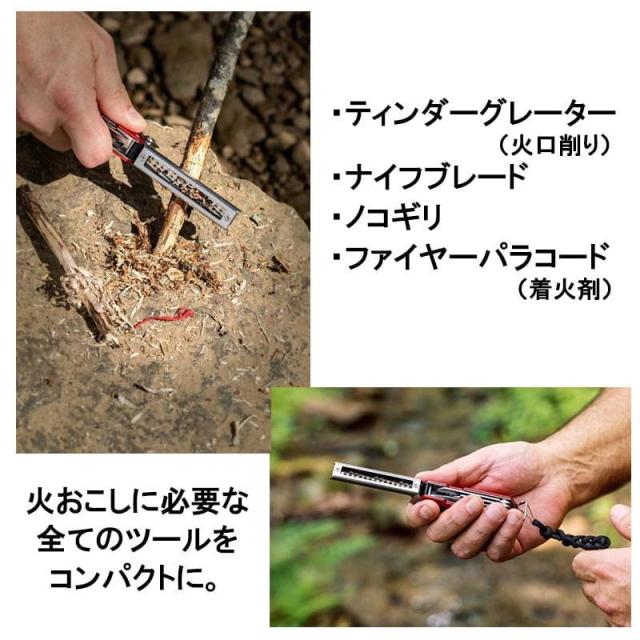 信頼のZIPPO社製フリントホイールをはじめ、耐久性のある高炭素銅ナイフ&ノコギリなどアウトドアでの着火に欠かせない7つのツールがひとつに備わっています。