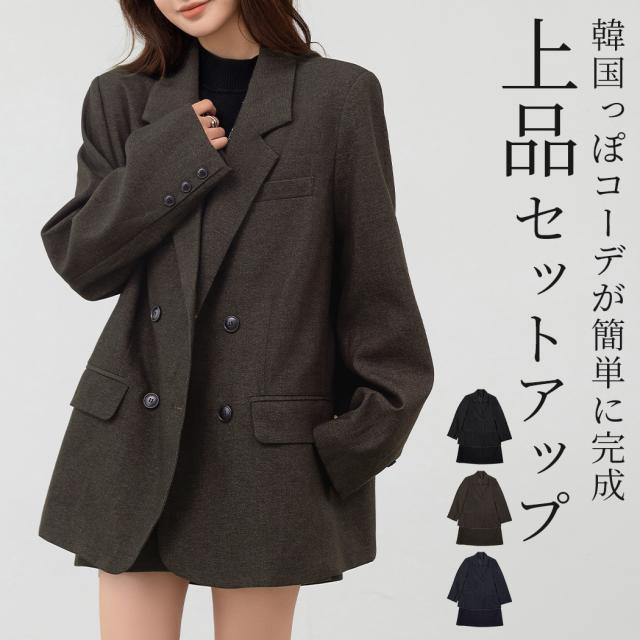 冬新作 「垢抜け韓国っぽコーデに」テーラードジャケット 長袖 スカート ミニ ストール セットアップ レディース 3点セット 前開き ボタン ツイル生地 肩パッド ポケット 裏地 ファスナー ウエストゴム ペチパン コーデ クロシェ編み 中厚手 秋 冬 春