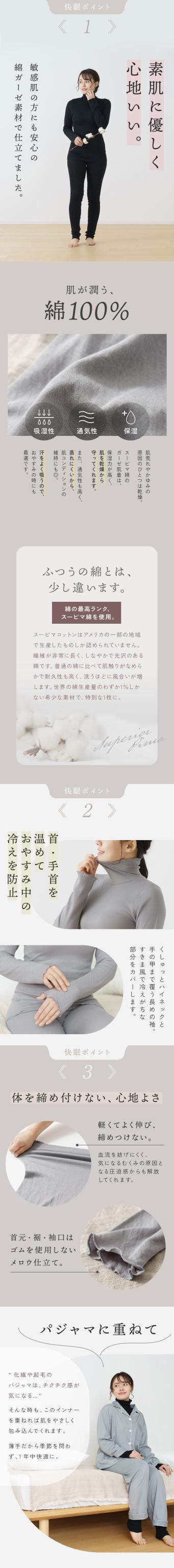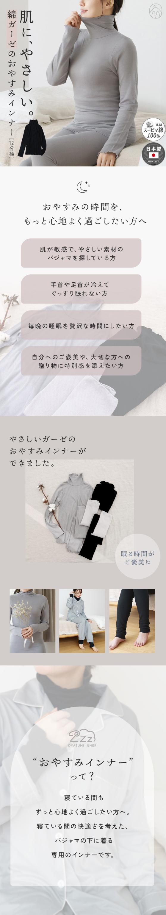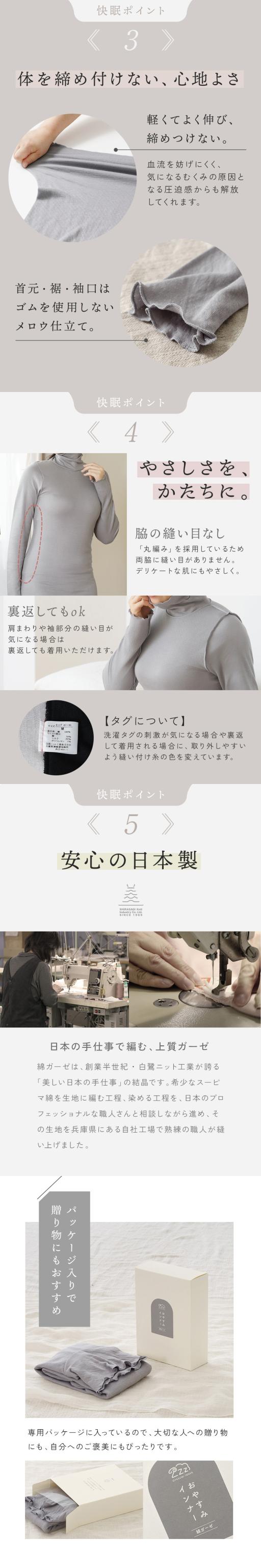 綿ガーゼ おやすみインナー 日本製 ハイネック 12分袖 長袖 パジャマ インナー トップス 長め レディース 温活 敏感肌 年間 肌着 服 綿100% 25AW D9240L-E