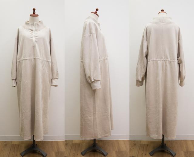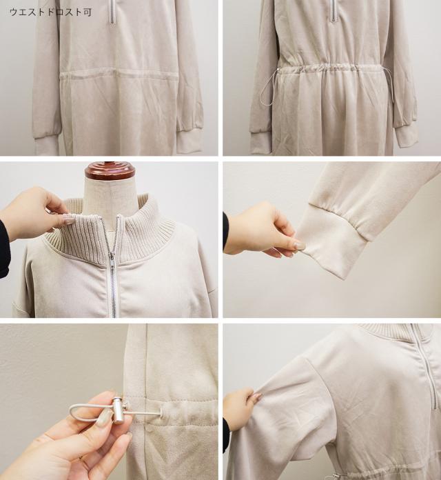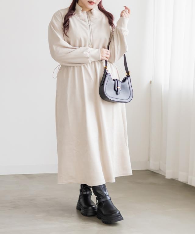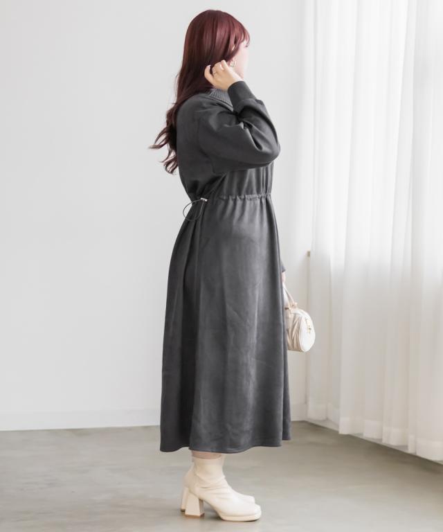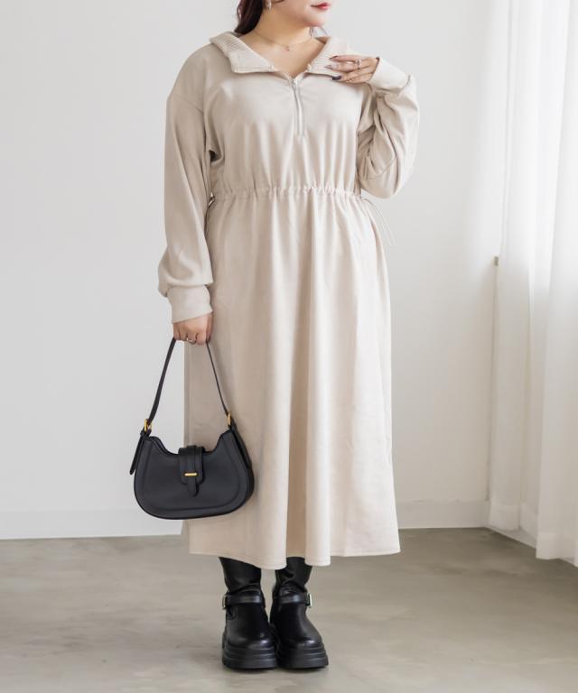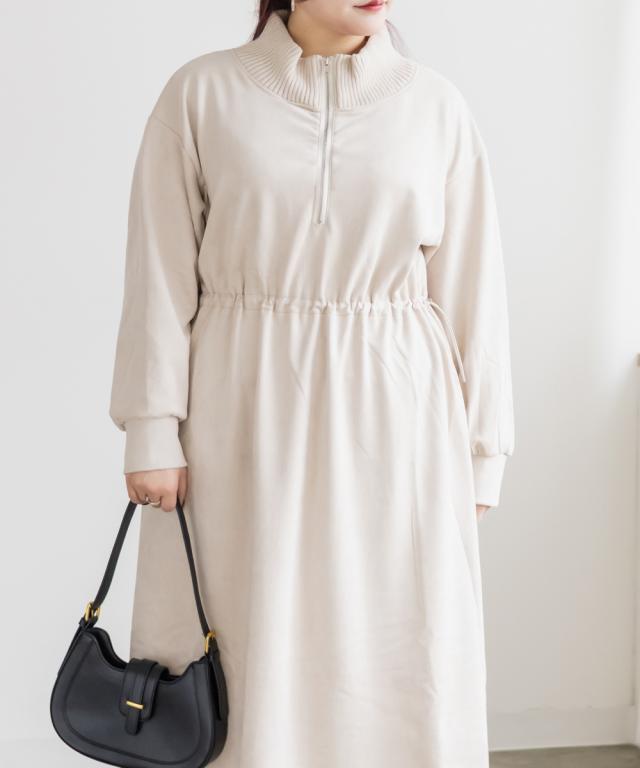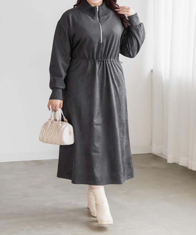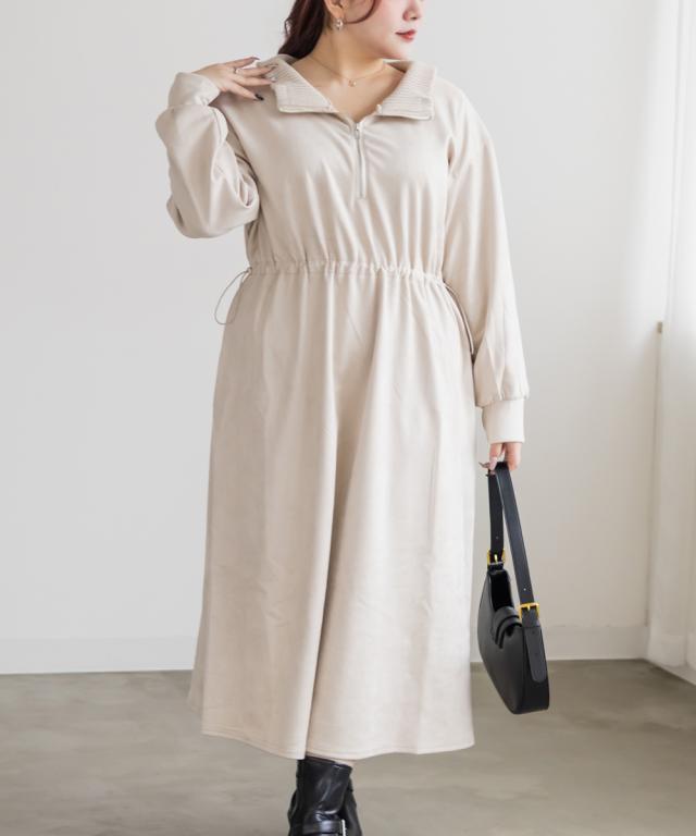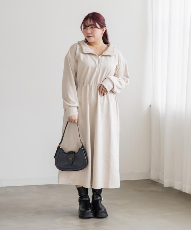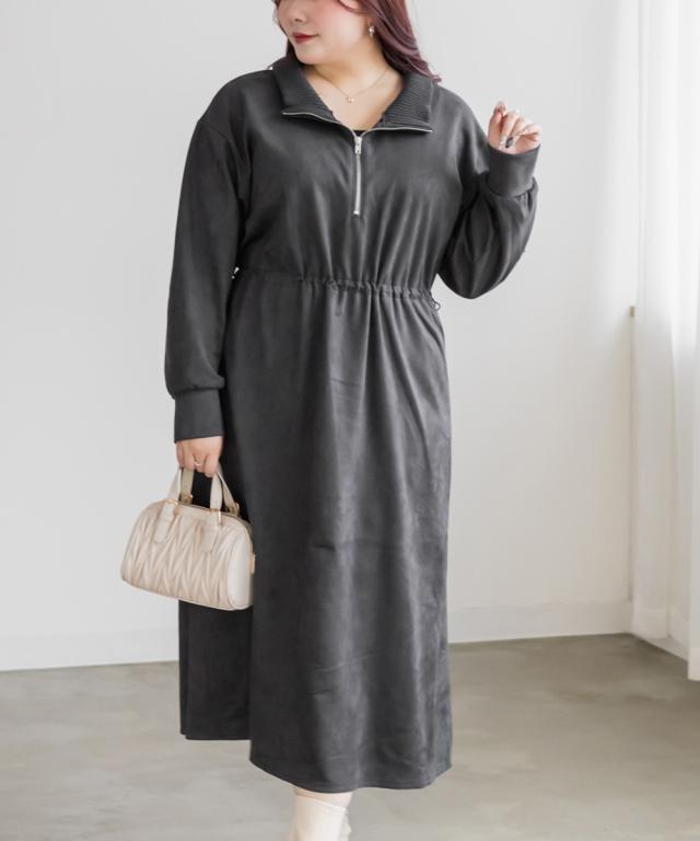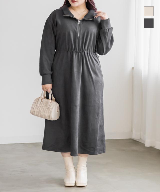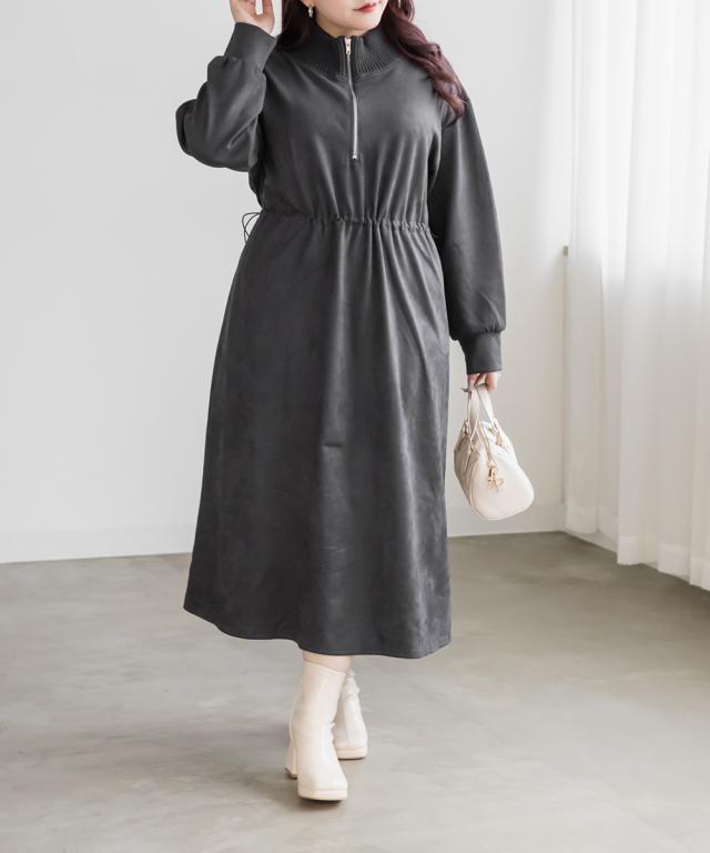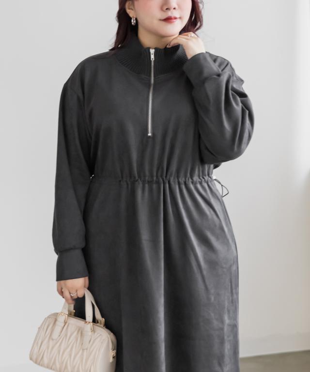 | 3Lサイズを着用してちょうどいいサイズ感でした。程よくゆとりがあってゆるっと着て可愛いデザインでした♪ウエストはドロスト出来て、フィット&フレアシルエットに出来ます◎ジップも好みで開けれるので詰まった襟が苦手な方にもおすすめなアイテムです。大人っぽいスエード生地でカジュアル過ぎないからフェミニンな雰囲気にもなれます。 |