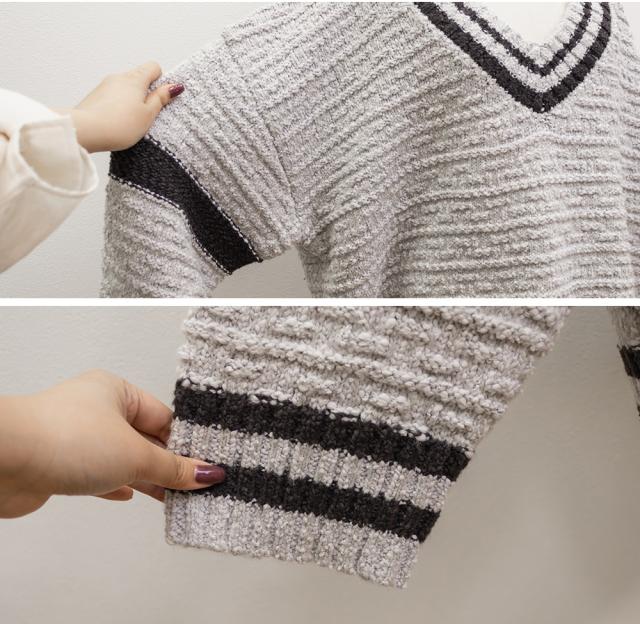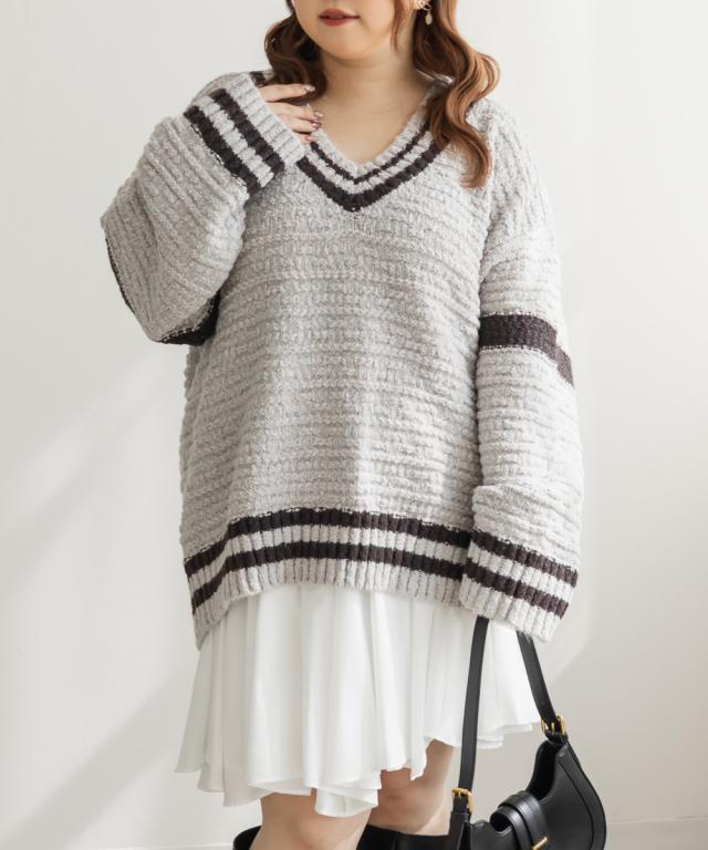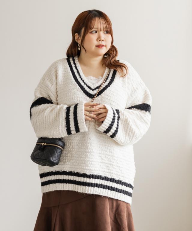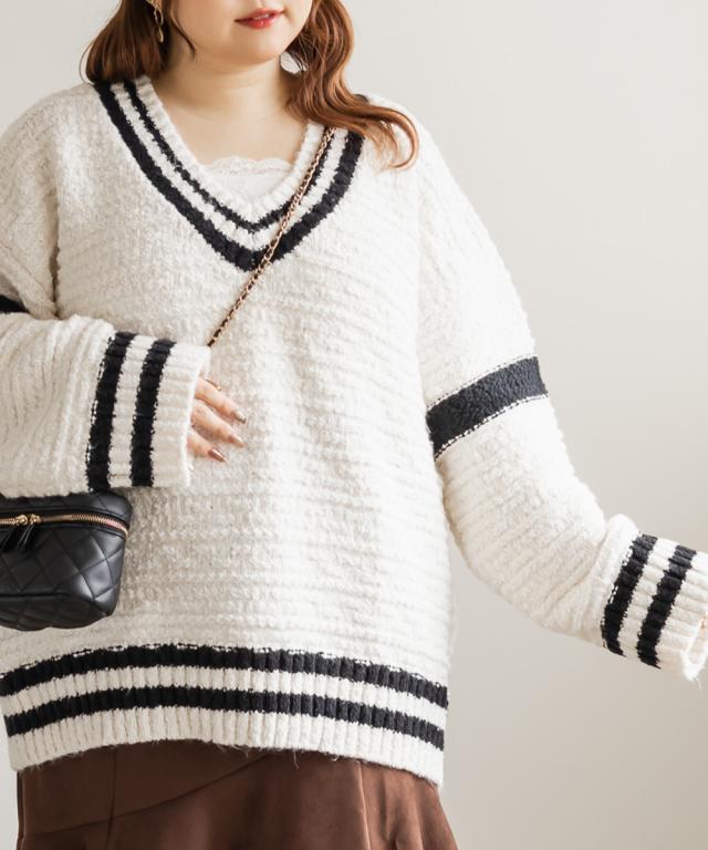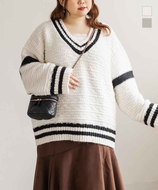 大きいサイズ/レディース/3L/4L/ライン入りVネックニット
