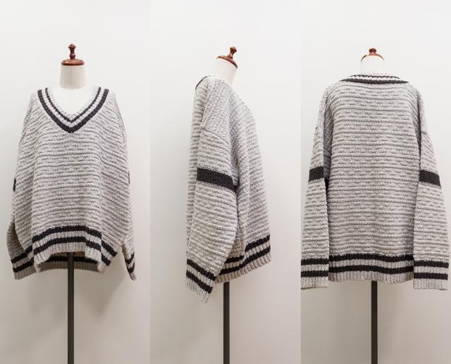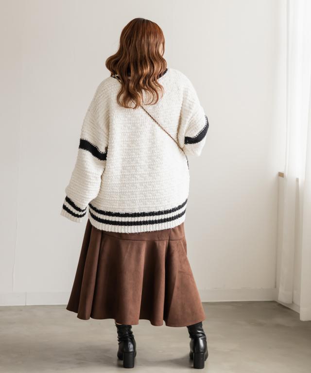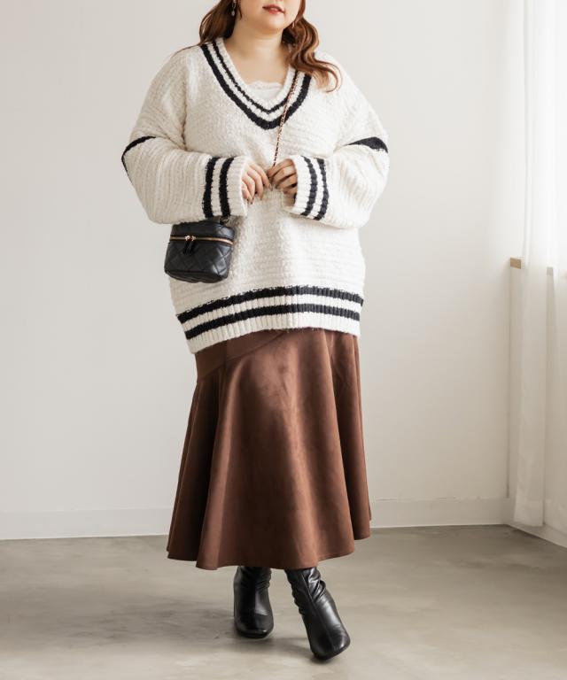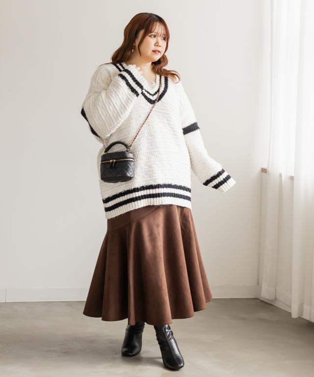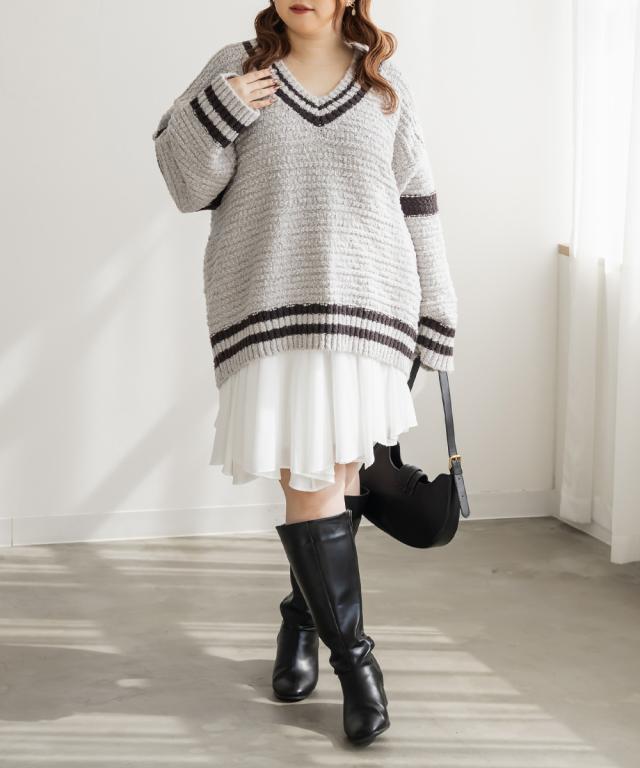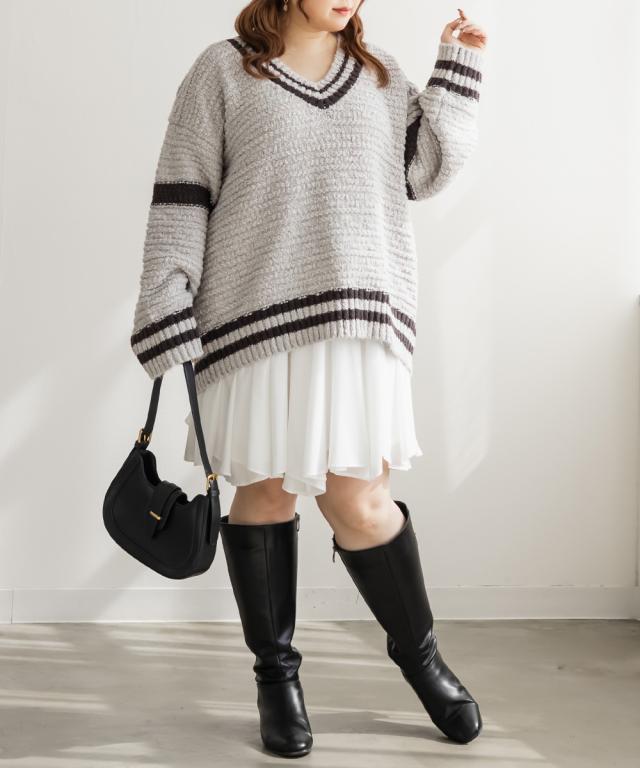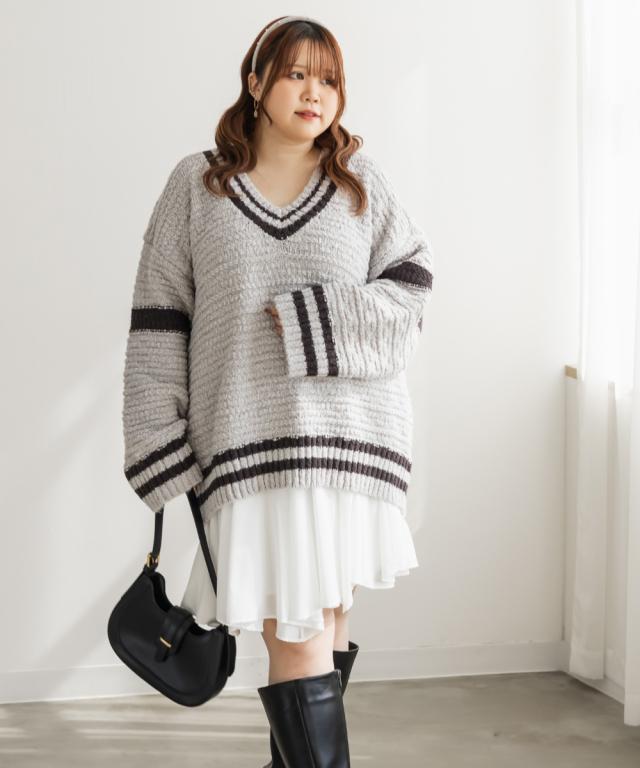 | 3Lサイズを着て、オーバーサイズでゆとりのある着心地でした!ゆるっと着られて可愛いです◎カジュアルめな印象のラインニットですが、スカートと合わせてフェミニンにもなれます♪深いVネックになっているので、ボリュームニットでもメリハリが付きすっきりした印象になります。ミニスカートを合わせてあざとい雰囲気にもおすすめです! |