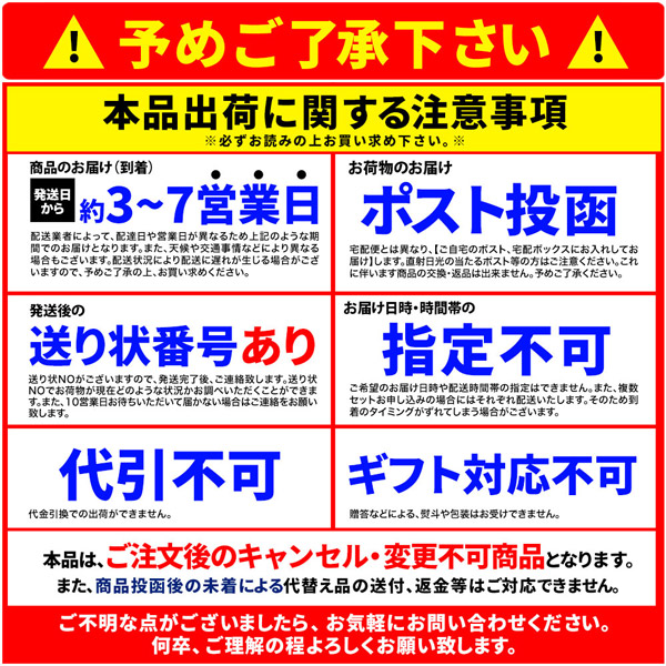 ・商品投函後の未着による代替品の送付、返金等はご対応できません。住所不備、受取拒否、長期不在により商品が返送された場合、キャンセル(返金)はできません。