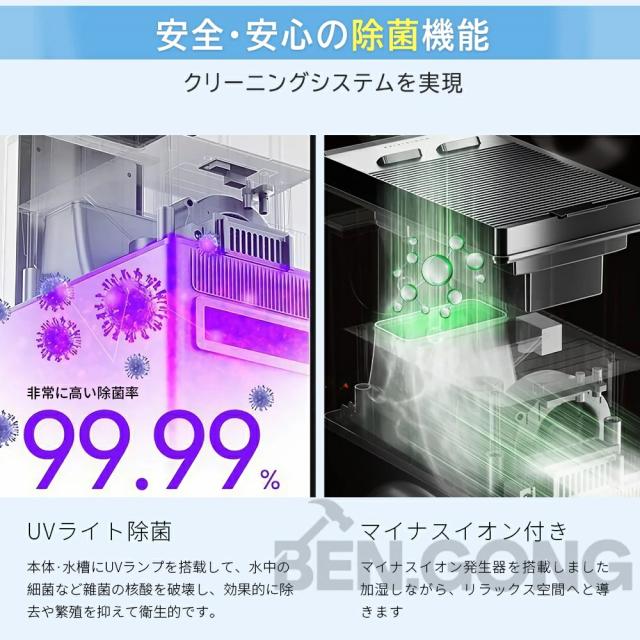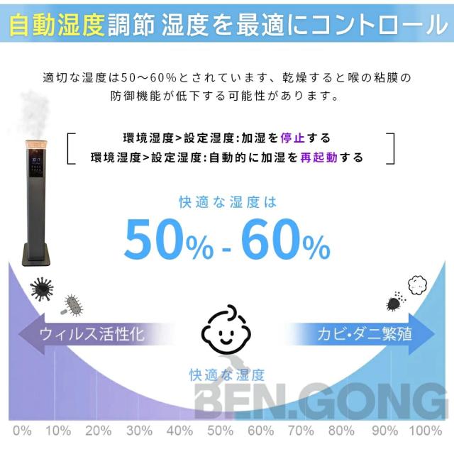 ◆湿度自動調整機能:湿度を45%〜95%まで設定できます。設定した湿度を超えると自動停止。設定した湿度より低くなると、再起動して加湿を行います。