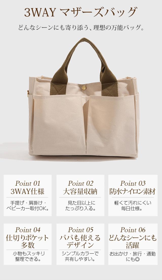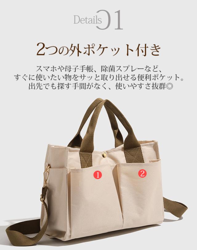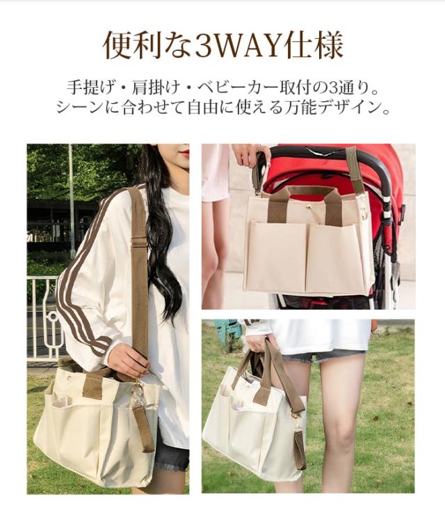 【 3WAY マザーズバッグ トート ショルダー 】 毎日の通勤やお出かけ、出産や入院の準備にも使える、軽くてコンパクトなマザーズバッグ。 撥水ナイロン素材で雨の日も安心、汚れてもサッと拭けてお手入れ簡単です。 A4が入る大きいサイズで、自立するしっかりしたトートタイプ。 内ポケット5つ+外ポケット2つ+取り外し可能な仕切り付きで、水筒や母子手帳、スマホ、鍵、哺乳瓶などをすっきり整理整頓。 メイン収納はファスナー付きで、防犯面も安心。 荷物が多くてもきれいに収まり、形が崩れにくい構造です。 ショルダーベルト付きの3WAY仕様で、トートにもショルダーバッグにもなる便利デザイン。 斜めがけで両手が空くので、ベビーカーやベビーベッドのそばでも使いやすく、外出時の移動もラクラク。 軽量で肩が痛くなりにくく、かわいい無地デザインはレディースにもメンズにもおすすめ。 マザーズバッグ トート 2way ショルダーバッグとしてはもちろん、旅行や通勤、推し活にも活躍します。 厚手キャンバス風のナイロン素材で大人っぽく、おしゃれで機能的。 使い込むほどに手になじみ、「買ってよかった」と感じられる一品です。 |