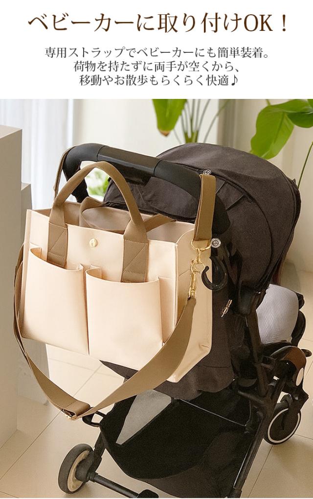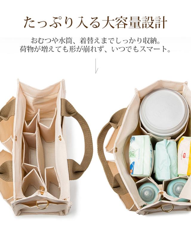 内ポケット5つ+外ポケット2つ+取り外し可能な仕切り付きで、水筒や母子手帳、スマホ、鍵、哺乳瓶などをすっきり整理整頓。