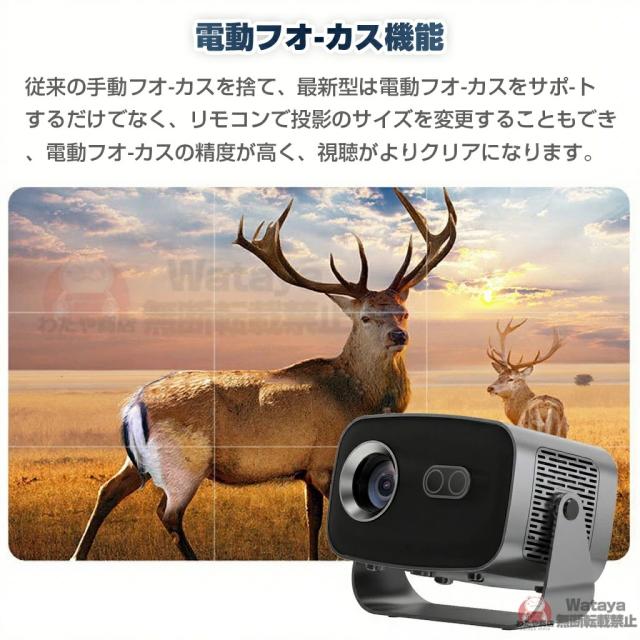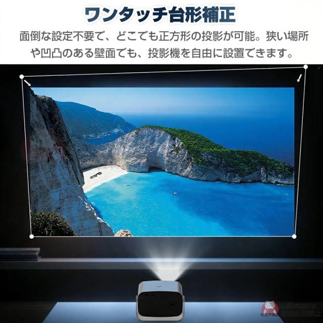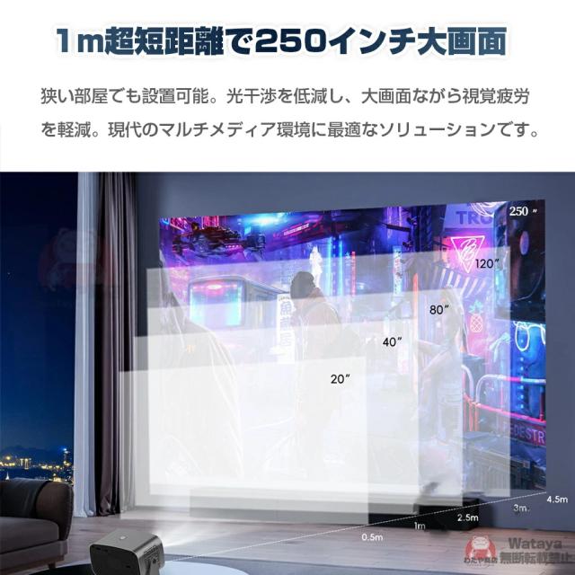 このスマートプロジェクターは自動台形補正技術,横置きでも斜め置きでも、垂直方向の自動台形補正機能により、傾いた画像を自動的に補正し;電動フォーカス技術搭載、わずか数秒で完璧な画像が得られます;このポータブルプロジェクターは短距離投影も備えており、投影距離は1〜5メートル、40〜250インチの大型スクリーンに対応している