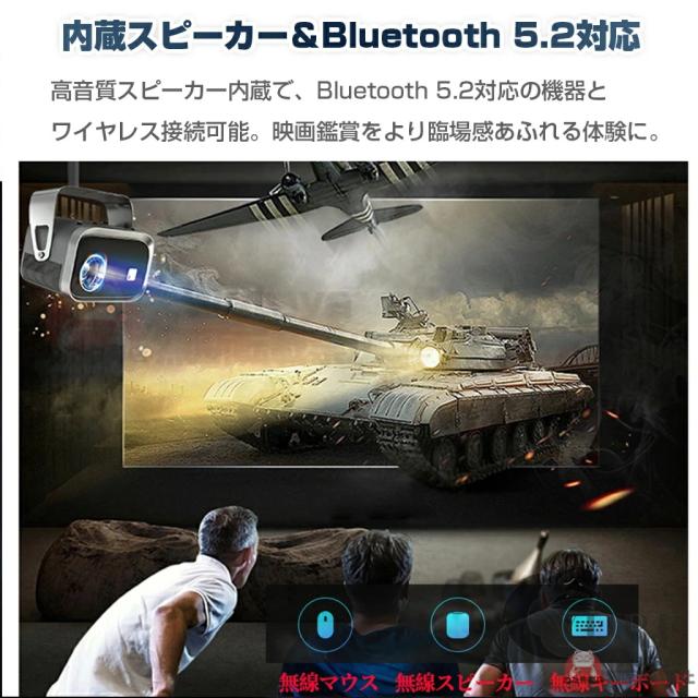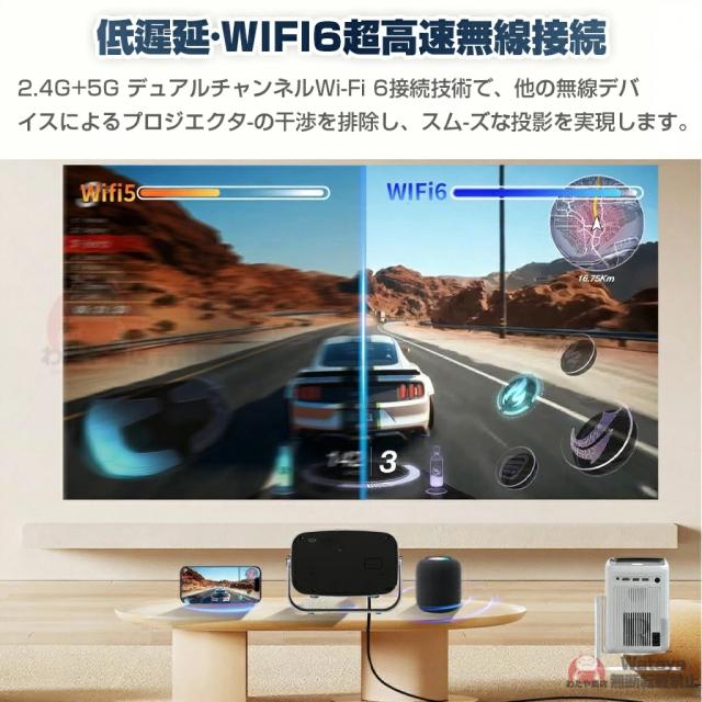 プロジェクターは、超高速5G&2.4Gと先進のWi-Fi6技術を搭載しており、遅延を最大60%削減されて、より高速で安定したインターネット接続を実現します。Wi-Fi経由でiOS、AndroidおよびWindowsデバイスを素早く接続でき、超スムーズで遅延のないオンラインゲーム、映画鑑賞、ビデオ学習体験を簡単に楽しむことができます。また、Bluetooth5.3も搭載し、ご愛用のスピーカーやワイヤレスイヤホンやから音声を流すことができ、迫力ある映像をこだわりの音響環境で映画館のような雰囲気を楽しむことができます。