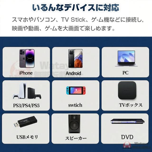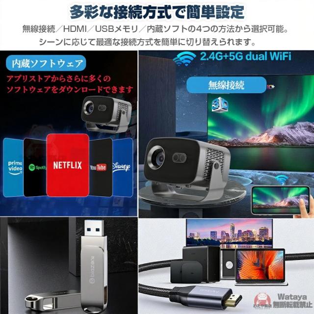 この家庭用プロジェクターはWi-Fi、Bluetooth接続以外に、HDMI、USB端子が搭載しており、ノートパソコン/スマホ/TVボックス/DVDプレーヤー/USBメモリー/Google Chrome cast/X-Box/PS3/PS4など様々な周辺機器に接続できます