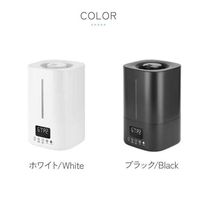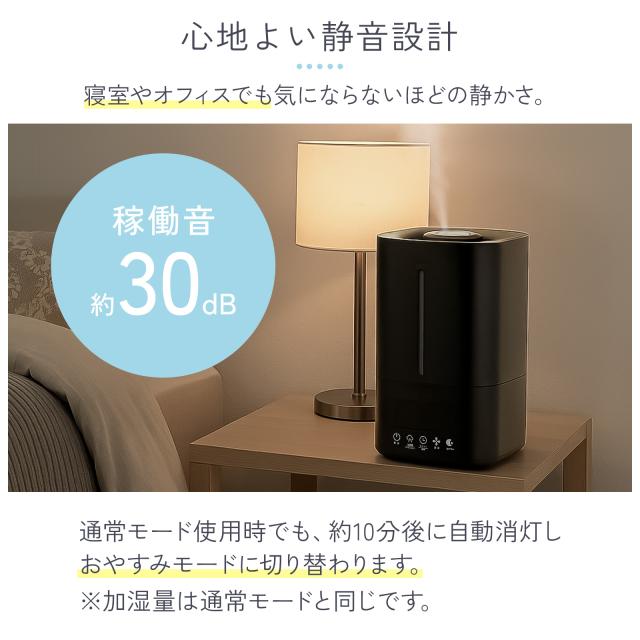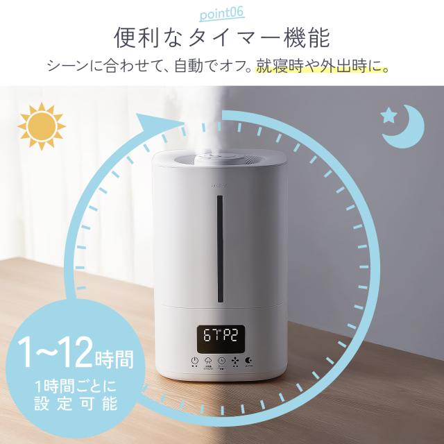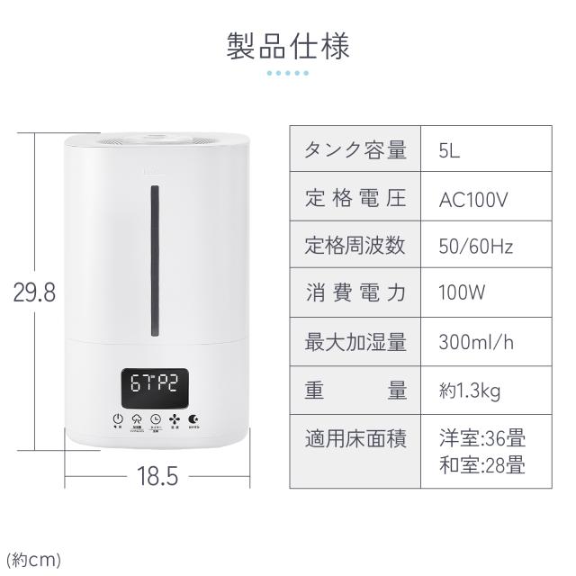 5Lの大容量タンクで長時間加湿でき、360°回転吹出口でお部屋全体をムラなくうるおします。