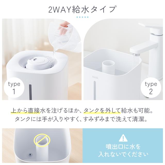 給水タンクは4Lと大容量。360°回転吹出口でお好きな方向を加湿。