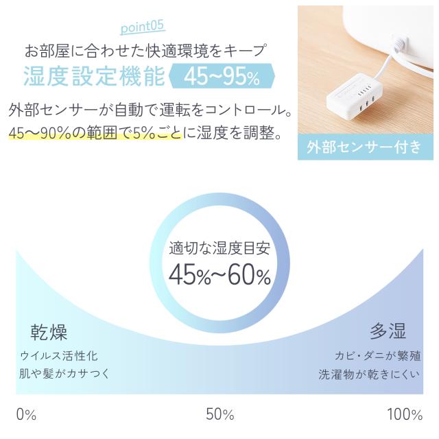 外部センサーで湿度を自動管理し、過加湿やカビを防ぎます。