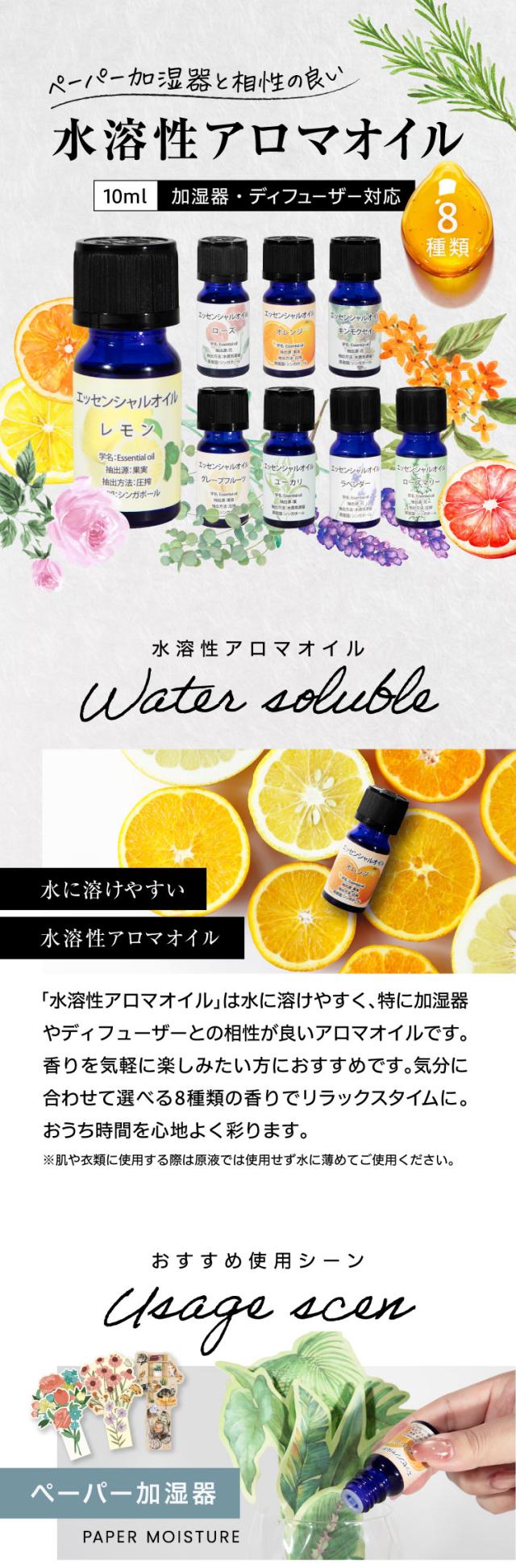 水溶性アロマオイル エッセンシャルオイル 10ml 選べる8種類の香り アロマ アロマオイル 水溶性タイプ 加湿器 ディフューザー 対応 加湿器用 レモン キンモクセイ 金木犀 ローズ ラベンダー グレープフルーツ ユーカリ オレンジ ローズマリー