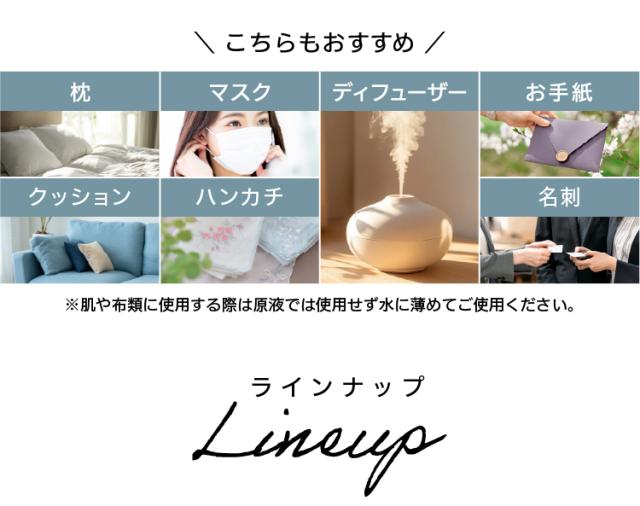 レモン:果実 キンモクセイ:花 ローズ:花 ラベンダー:花 グレープフルーツ:果実 ユーカリ:葉 オレンジ:果実 ローズマリー:花 |
