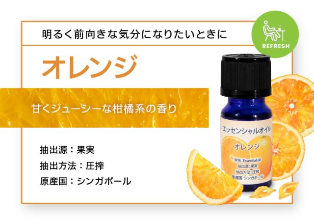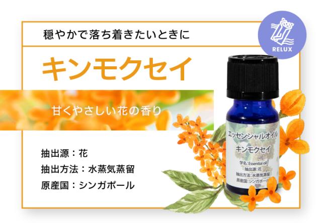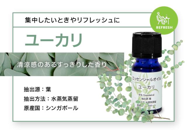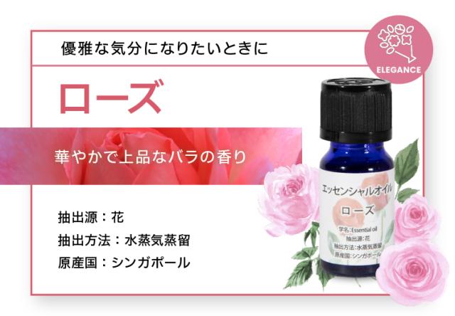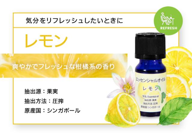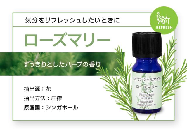 レモン:圧搾 キンモクセイ:水蒸気蒸留 ローズ:水蒸気蒸留 ラベンダー:水蒸気蒸留 グレープフルーツ:圧搾 ユーカリ:水蒸気蒸留 オレンジ:圧搾 ローズマリー:圧搾 |
