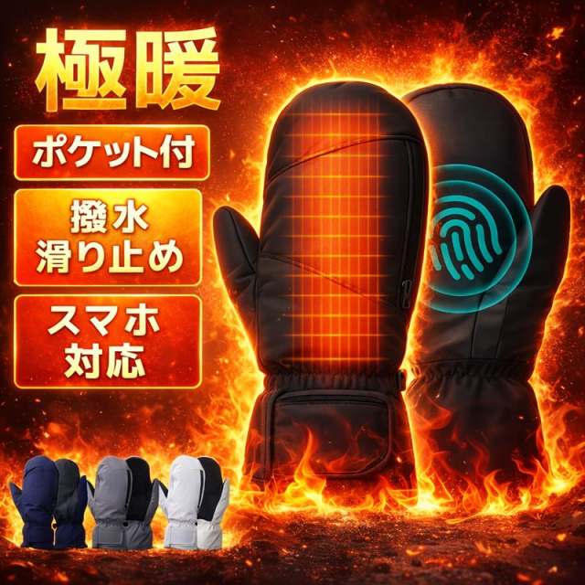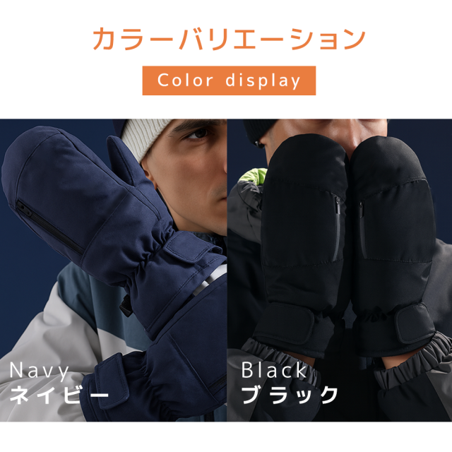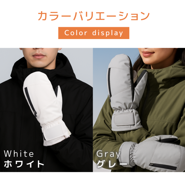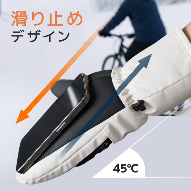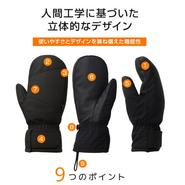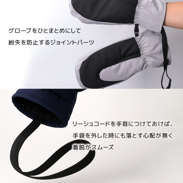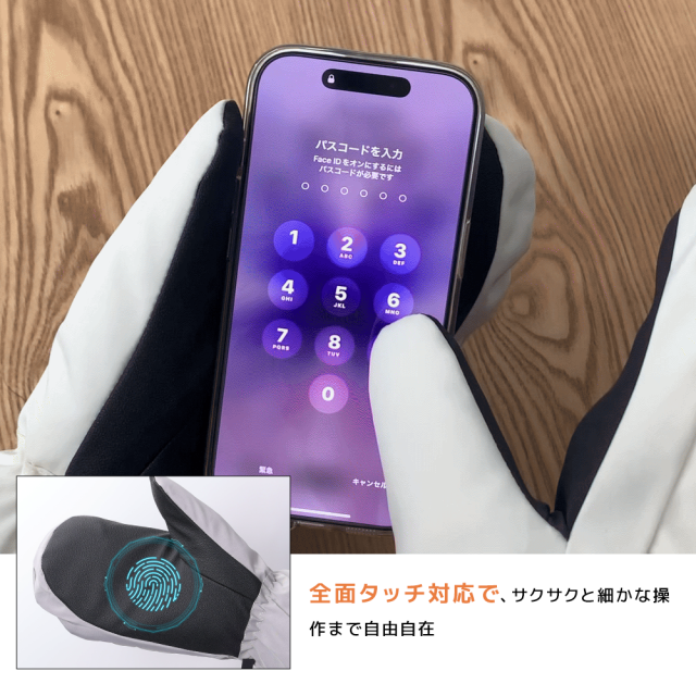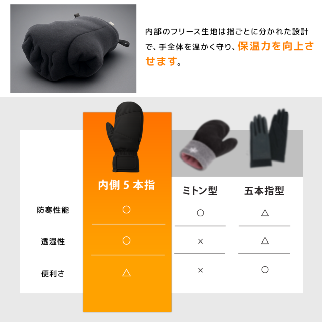 ミトン×5本指構造で保温性と動きやすさを両立、スマホ操作もOK。