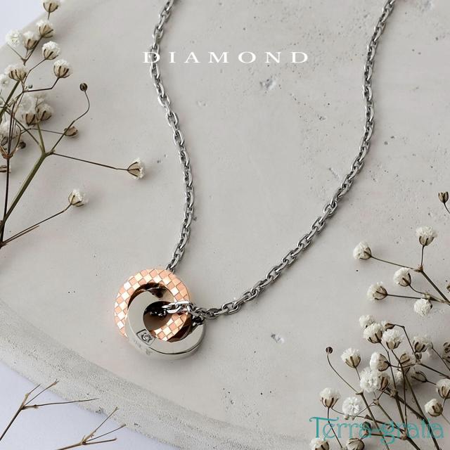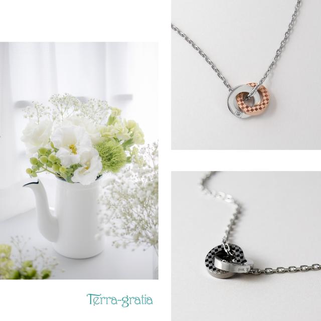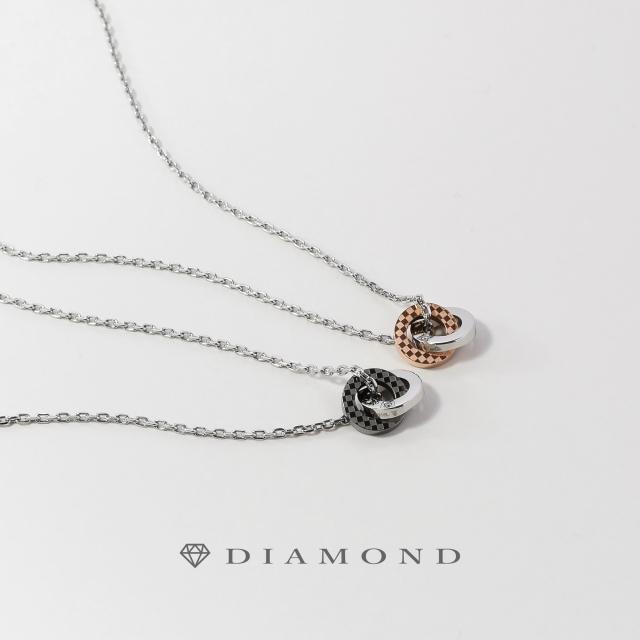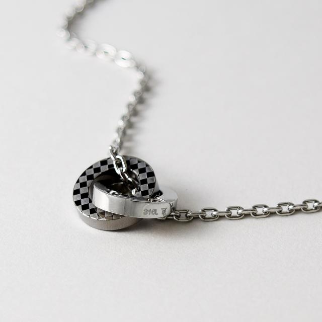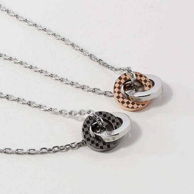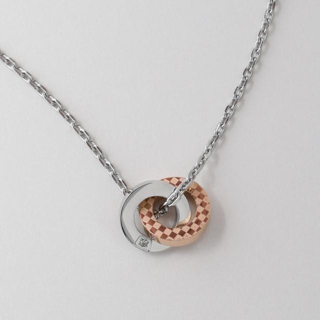 格子柄とダイヤモンドがあしらわれたダブルリングデザインのペアネックレスが、大人の洗練されたスタイルを演出します。