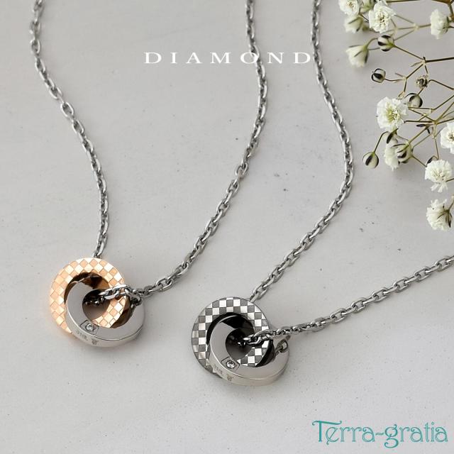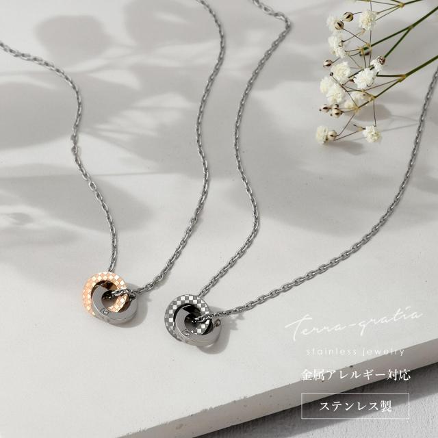 ペアネックレス ステンレス 刻印 大人 ブランド シンプル 金属アレルギー対応 つけっぱなし 格子柄 ダイヤモンド 2連 ダブルリング インフィニティ サージカルステンレス 2本セット Terra-gratia テラグラティア lstn031gun_rg_pair
