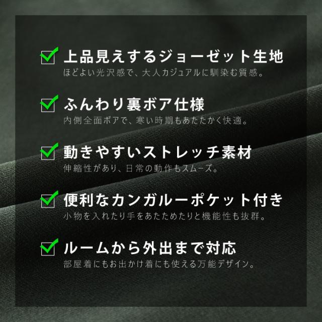 上品さと快適さを両立!ジョーゼットメンズスウェットが新登場!上品な風合いとやわらかな着心地を兼ね備えた、メンズクルーネックジョーゼットスウェットトレーナーが登場しました。表地はしっとりとしたジョーゼット生地を使用し、カジュアルすぎない上品な印象に。内側はふんわり裏シャギーボア仕様で、寒い季節もあたたかく過ごせます。カンガルーポケット付きで、手元もあたためながら便利に使えるデザイン。伸縮性のあるストレッチ素材なので動きやすく、部屋着としても外出時にも重宝します。スリムなパンツやジョガーと合わせると、バランスの取れたリラックススタイルが完成します。